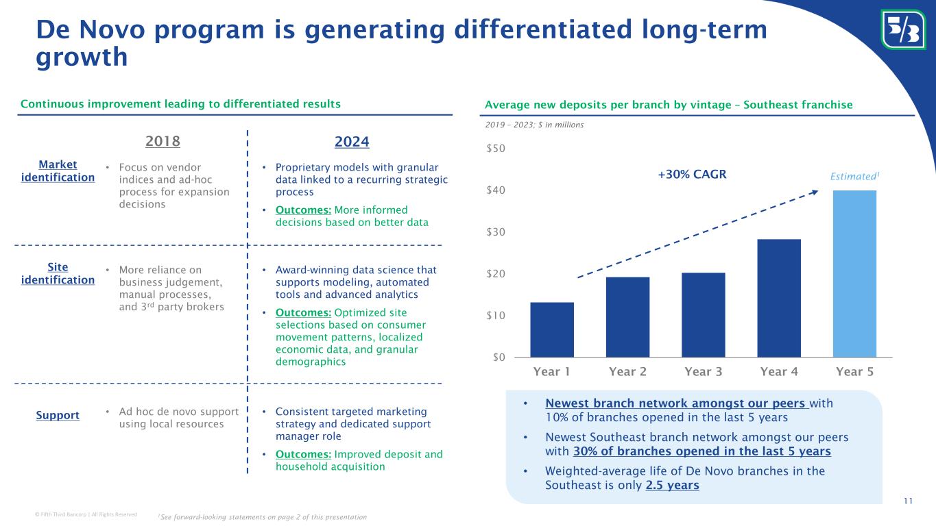 © Fifth Third Bancorp | All Rights Reserved • Opened 100+ branches in Southeast markets over last 5 years • Added 2 nd most new branches in the Southeast over the past 3 years 164 101 Well-positioned to further market share gains in high- growth Southeast 1 Data sourced from S&P Global Market Intelligence; 2 See forward-looking statements on page 2 of this presentation 10 $31BN deposits $18BN loans ~18% of total ~15% of total #6 largest retail bank in the Southeast > 15 added 10-15 added 5-10 added < 5 added Branch openings since 2019 2018 1Q24 2028E By 2028, we expect: • To open 35 - 45 branches per year through 2028 • Continue to add in-footprint markets with a focus on mid-sized metro areas • Targeting 8% locational share in the markets we compete ~20% ~80% 31% 69% ~50% ~50% Midwest Southeast Expect branch footprint to be ~50% in the Southeast by 2028 2 US ~2x Southeast has favorable population trends FITB SE footprint Expected population growth (2024 – 2029 CAGR) 1