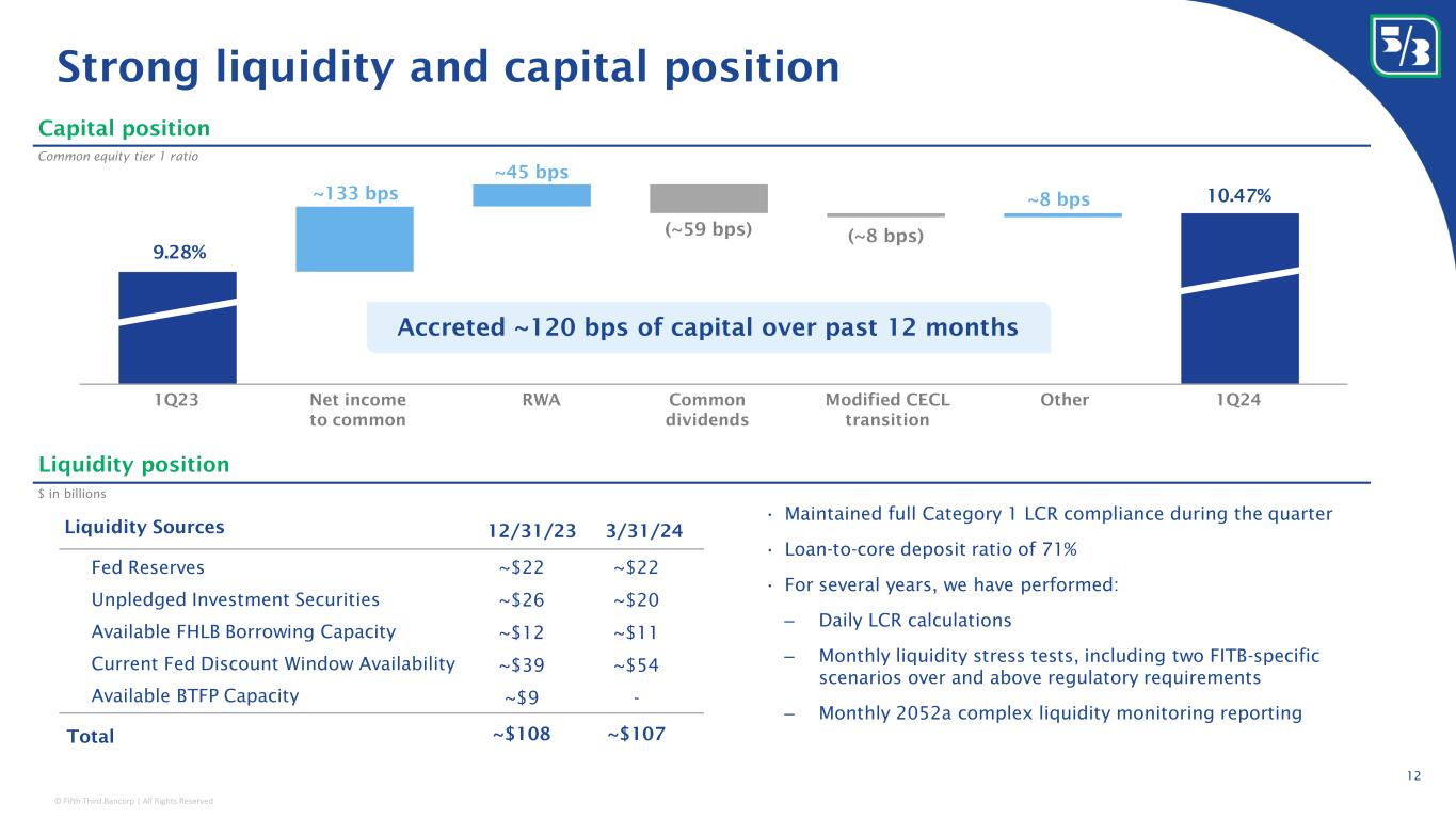 © Fifth Third Bancorp | All Rights Reserved 12 Strong liquidity and capital position Liquidity position $ in billions Fed Reserves Unpledged Investment Securities Available FHLB Borrowing Capacity Current Fed Discount Window Availability Total ~$22 ~$20 ~$11 ~$54 ~$107 12/31/23 Available BTFP Capacity - Capital position Common equity tier 1 ratio ~$22 ~$26 ~$12 ~$39 ~$108 ~$9 Liquidity Sources 3/31/24 • Maintained full Category 1 LCR compliance during the quarter • Loan-to-core deposit ratio of 71% • For several years, we have performed: ‒ Daily LCR calculations ‒ Monthly liquidity stress tests, including two FITB-specific scenarios over and above regulatory requirements ‒ Monthly 2052a complex liquidity monitoring reporting 1Q23 1Q24Net income to common RWA Common dividends Modified CECL transition Other 9.28% 10.47%~133 bps ~45 bps ~8 bps (~59 bps) (~8 bps) Accreted ~120 bps of capital over past 12 months