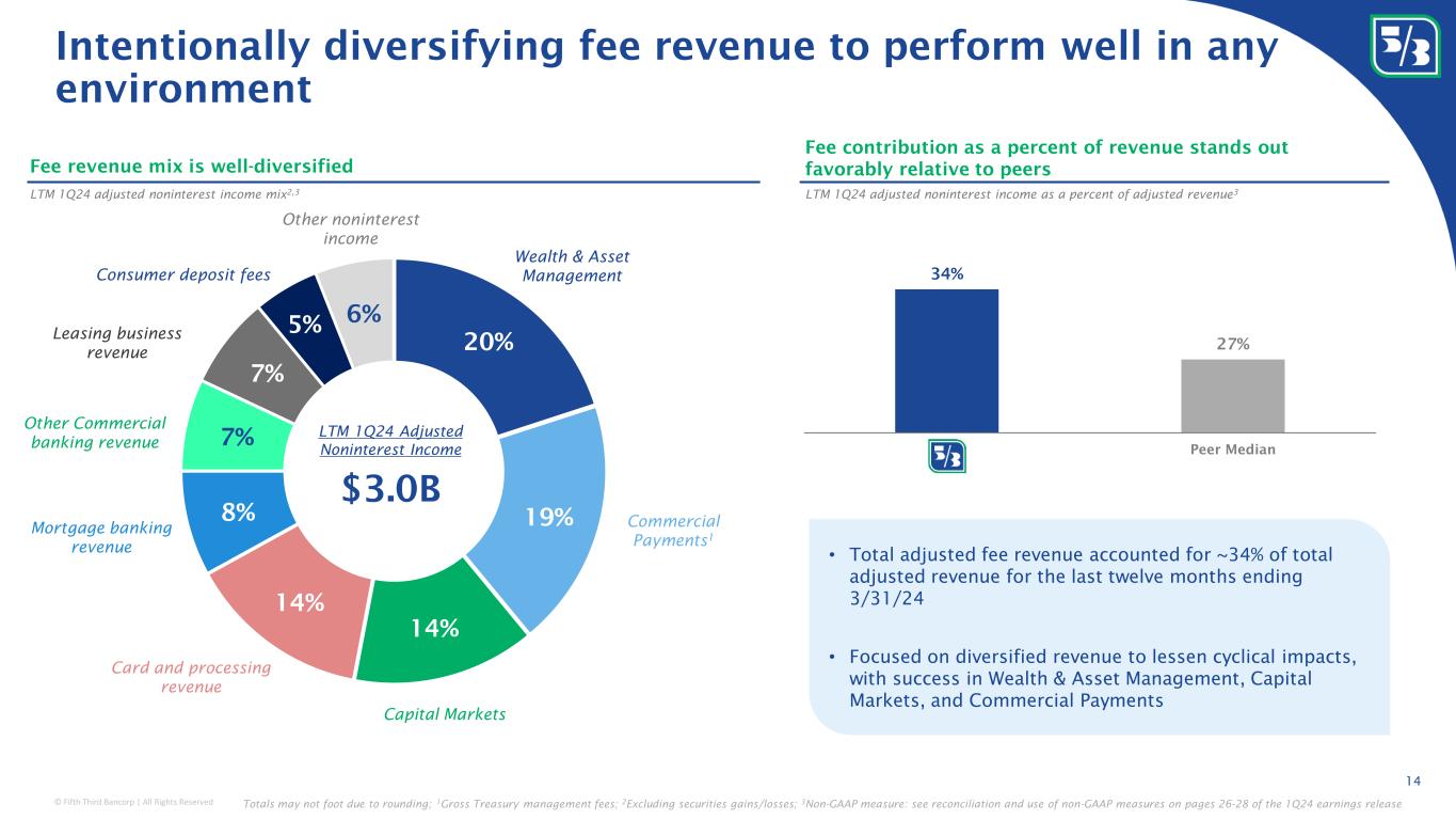 © Fifth Third Bancorp | All Rights Reserved 41% 37% 36% 30% 26% 22% 17% 16% 16% 15% 14% 14% 13% Peer 12 Peer 11 Peer 10 Peer 9 Peer 8 Peer 7 Peer 6 Peer 5 Peer 4 Peer 3 Peer 2 x Peer 1 CRE portfolio is well-positioned 13 Comparing CRE portfolios relative to peers 1 Source: FR Y-9C filings; CRE includes the following captions within schedule HC-C: 1a - construction, land development & other land loans, 1d – secured by multifamily (5 or more) residential properties, 1e – secured by nonfarm nonresidential properties; 2 Source: GAAP filings; CRE criticized asset ratios exclude owner-occupied loans where applicable As of 3/31/24 CRE loans 1 / total loans Among the lowest CRE concentration relative to peers with strong credit quality 276% 232% 188% 179% 142% 136% 98% 89% 88% 84% 81% 80% 73% Peer 12 Peer 11 Peer 9 Peer 10 Peer 8 Peer 7 Peer 4 Peer 6 Peer 3 Peer 5 Peer 1 Peer 2 x CRE loans 1 / total capital CRE criticized asset ratio 2 1 Q 2 4 C R E c r i t i c i z e d a s s e t r a t i o In t e r s e c t i s p e e r m e d i a n Peer 7 Peer 10 Peer 8 Peer 11 Peer 4 Peer 5 Peer 9 Peer 2 Peer 3 Peer 6 Peer 1 Peer 12 0% 5% 10% 15% 20% 25% 30% 0% 2% 4% 6% 8% 10% 12% Change in CRE criticized asset ratio 1Q24 vs. 1Q23