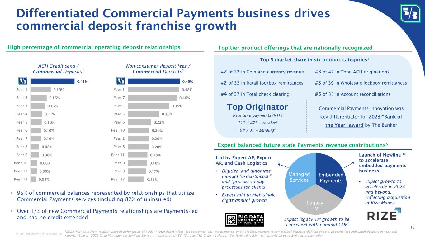 © Fifth Third Bancorp | All Rights Reserved Intentionally diversifying fee revenue to perform well in any environment • Total adjusted fee revenue accounted for ~34% of total adjusted revenue for the last twelve months ending 3/31/24 • Focused on diversified revenue to lessen cyclical impacts, with success in Wealth & Asset Management, Capital Markets, and Commercial Payments 14 20% 19% 14% 14% 8% 7% 7% 5% 6% Fee revenue mix is well-diversified LTM 1Q24 adjusted noninterest income mix 2,3 Wealth & Asset Management Card and processing revenue Mortgage banking revenue Leasing business revenue Other noninterest income LTM 1Q24 Adjusted Noninterest Income $3.0B Capital Markets Other Commercial banking revenue Commercial Payments 1 Consumer deposit fees Totals may not foot due to rounding; 1 Gross Treasury management fees; 2 Excluding securities gains/losses; 3 Non-GAAP measure: see reconciliation and use of non-GAAP measures on pages 26-28 of the 1Q24 earnings release 34% 27% x Peer Median Fee contribution as a percent of revenue stands out favorably relative to peers LTM 1Q24 adjusted noninterest income as a percent of adjusted revenue 3