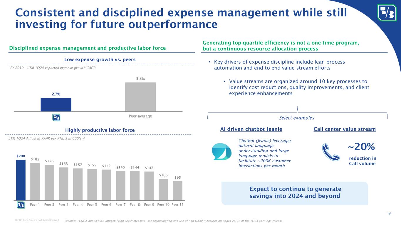 © Fifth Third Bancorp | All Rights Reserved 0.05% 0.06% 0.06% 0.08% 0.08% 0.10% 0.10% 0.10% 0.11% 0.13% 0.15% 0.19% 0.41% Peer 12 Peer 11 Peer 10 Peer 9 Peer 8 Peer 7 Peer 6 Peer 5 Peer 4 Peer 3 Peer 2 Peer 1 x Differentiated Commercial Payments business drives commercial deposit franchise growth 15 ACH Credit send / Commercial Deposits 1 Top tier product offerings that are nationally recognizedHigh percentage of commercial operating deposit relationships #2 of 37 in Coin and currency revenue #2 of 32 in Retail lockbox remittances #4 of 37 in Total check clearing #3 of 42 in Total ACH originations #3 of 39 in Wholesale lockbox remittances #5 of 35 in Account reconciliations Top 5 market share in six product categories 3 Top Originator Commercial Payments innovation was key differentiator for 2023 “Bank of the Year” award by The Banker 11 th / 473 – receive 4 9 th / 37 – sending 4 Real time payments (RTP) • 95% of commercial balances represented by relationships that utilize Commercial Payments services (including 82% of uninsured) • Over 1/3 of new Commercial Payments relationships are Payments-led and had no credit extended 0.16% 0.17% 0.18% 0.18% 0.20% 0.20% 0.20% 0.22% 0.30% 0.39% 0.46% 0.48% 0.49% Peer 12 Peer 3 Peer 9 Peer 11 Peer 8 Peer 2 Peer 10 Peer 6 Peer 5 Peer 4 Peer 7 Peer 1 x Non-consumer deposit fees / Commercial Deposits 2 1 2023 ACH data from NACHA; deposit balances as of 4Q23; 2 Total deposit fees less consumer (OD, maintenance, and ATM fees) relative to commercial deposits (defined as total deposits less individual deposits per the call report); 3 Source: 2023 Cash Management Services Survey administered by EY; 4 Source: The Clearing House; 5 See forward-looking statements on page 2 of this presentation Led by Expert AP, Expert AR, and Cash Logistics • Digitize and automate manual “order-to-cash” and “procure-to-pay” processes for clients • Expect mid-to-high single digits annual growth Expect balanced future state Payments revenue contributions 5 Legacy TM Managed Services Embedded Payments Launch of Newline TM to accelerate embedded payments business • Expect growth to accelerate in 2024 and beyond, reflecting acquisition of Rize Money Expect legacy TM growth to be consistent with nominal GDP