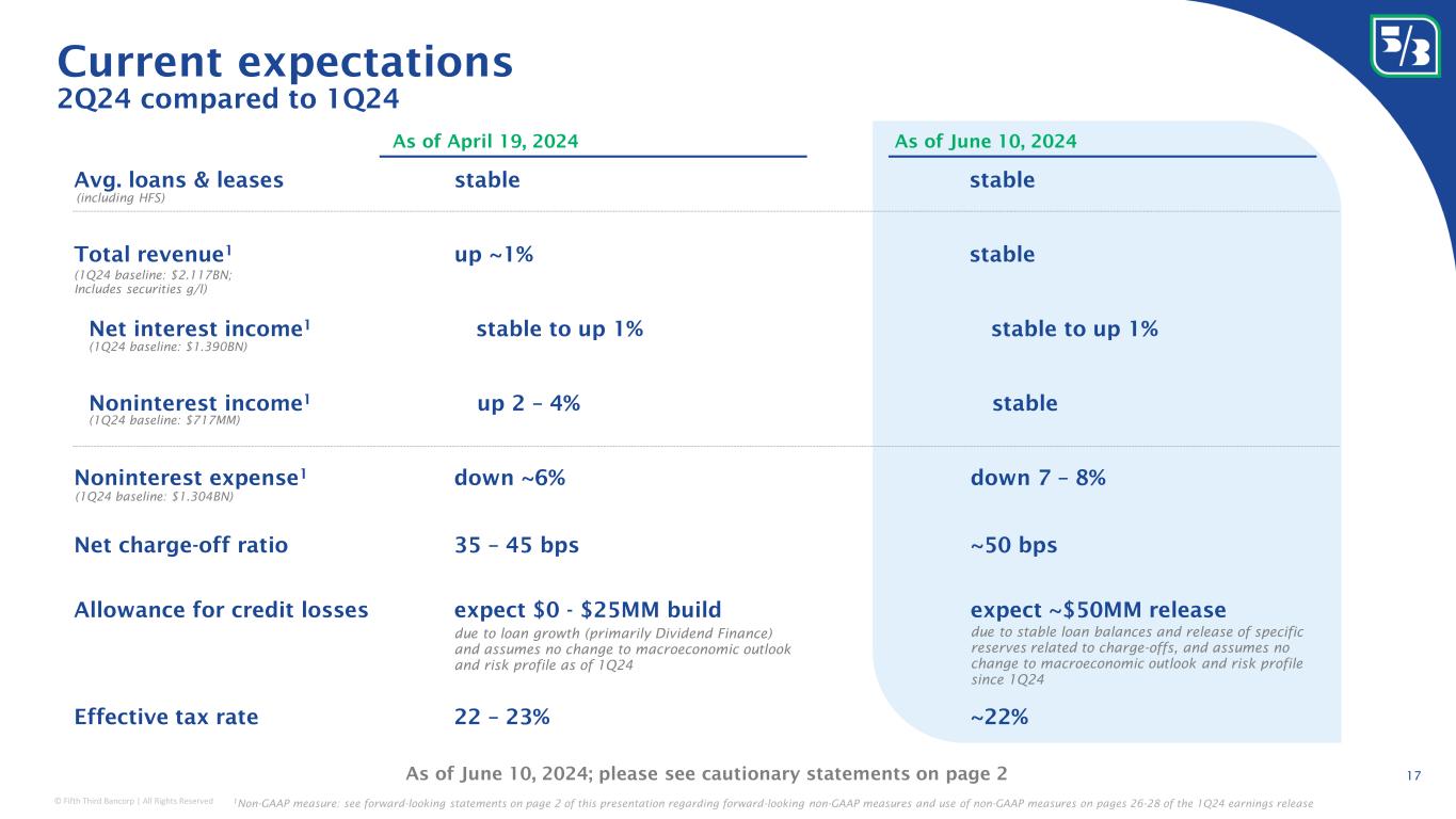 © Fifth Third Bancorp | All Rights Reserved 2.7% 5.8% x Peer average $200 $185 $176 $163 $157 $155 $152 $145 $144 $142 $106 $95 x Peer 1 Peer 2 Peer 3 Peer 4 Peer 5 Peer 6 Peer 7 Peer 8 Peer 9 Peer 10 Peer 11 16 Disciplined expense management and productive labor force Generating top-quartile efficiency is not a one-time program, but a continuous resource allocation process LTM 1Q24 Adjusted PPNR per FTE; $ in 000’s 1,2 Low expense growth vs. peers Highly productive labor force AI driven chatbot Jeanie FY 2019 – LTM 1Q24 reported expense growth CAGR • Key drivers of expense discipline include lean process automation and end-to-end value stream efforts • Value streams are organized around 10 key processes to identify cost reductions, quality improvements, and client experience enhancements Consistent and disciplined expense management while still investing for future outperformance Select examples reduction in Call volume Expect to continue to generate savings into 2024 and beyond Chatbot (Jeanie) leverages natural language understanding and large language models to facilitate ~200K customer interactions per month Call center value stream ~20% 1 Excludes FCNCA due to M&A impact; 2 Non-GAAP measure: see reconciliation and use of non-GAAP measures on pages 26-28 of the 1Q24 earnings release