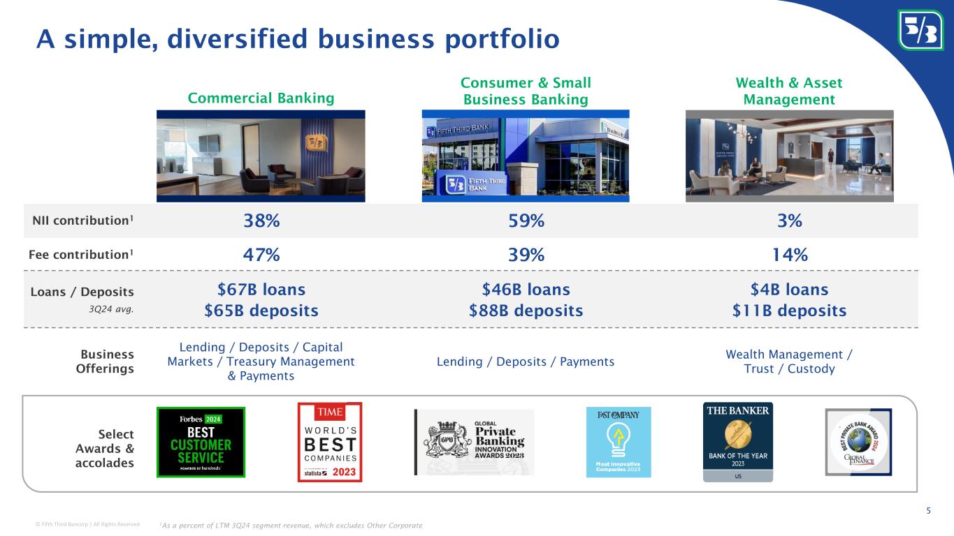© Fifth Third Bancorp | All Rights Reserved Midwest footprint Major FITB markets 2 with a top 5 deposit share London office Leading position in the markets we compete in 3 Key Southeast MSAs of focus Toronto office Top performing regional bank with local scale and national reach 4 Fifth Third Corporate Headquarters Cincinnati, Ohio Assets $214 billion Ranked 10 th in the U.S. 1 Deposits $168 billion Ranked 9 th in the U.S. 1 U.S. branches 1,072 Ranked 8 th in the U.S. 1 Commercial Payments Top 5 market share across several product categories 5 Southeast footprint #2 #6Midwest Southeast unchanged YoY unchanged YoY Deposit share rankings 4 #3 Fifth Third footprint unchanged YoY Significant locational share in notable MSAs Nashville, TN Charlotte, NC #3 #4 Cincinnati, OH #1 Chicago, IL #3 Top 10 deposit share in ~96% of retail footprint Columbus, OH Indianapolis, IN #3 #3 Tampa, FL #6 Grand Rapids, MI #1 Assets, deposits, and branches as of 9/30/24; 1 Rankings as of 9/30/24 and consist of US commercial banks and exclude credit card issuers and foreign, trust, card focused & traditional investment banks; 2 Includes MSAs with $5BN+ in deposits on a capped basis (deposits per branch capped at $250MM per June 2024 FDIC data); 3 Data sourced from S&P Global Market Intelligence; 4 Deposits per branch capped at $250MM per June 2024 FDIC data; Midwest and Southeast rankings represent in footprint deposit market share; 5 Source: 2023 Cash Management Services Survey administered by EY