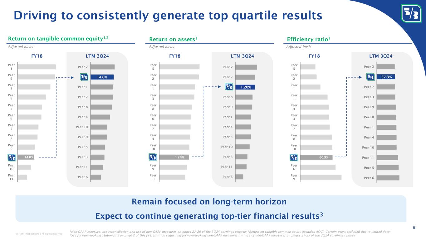 © Fifth Third Bancorp | All Rights Reserved Commercial Banking Lending / Deposits / Capital Markets / Treasury Management & Payments $67B loans $65B deposits Consumer & Small Business Banking Wealth & Asset Management Business Offerings Loans / Deposits $4B loans $11B deposits $46B loans $88B deposits Select Awards & accolades A simple, diversified business portfolio NII contribution 1 Fee contribution 1 38% 59% 3% 47% 39% 14% 3Q24 avg. Lending / Deposits / Payments Wealth Management / Trust / Custody 1 As a percent of LTM 3Q24 segment revenue, which excludes Other Corporate 5