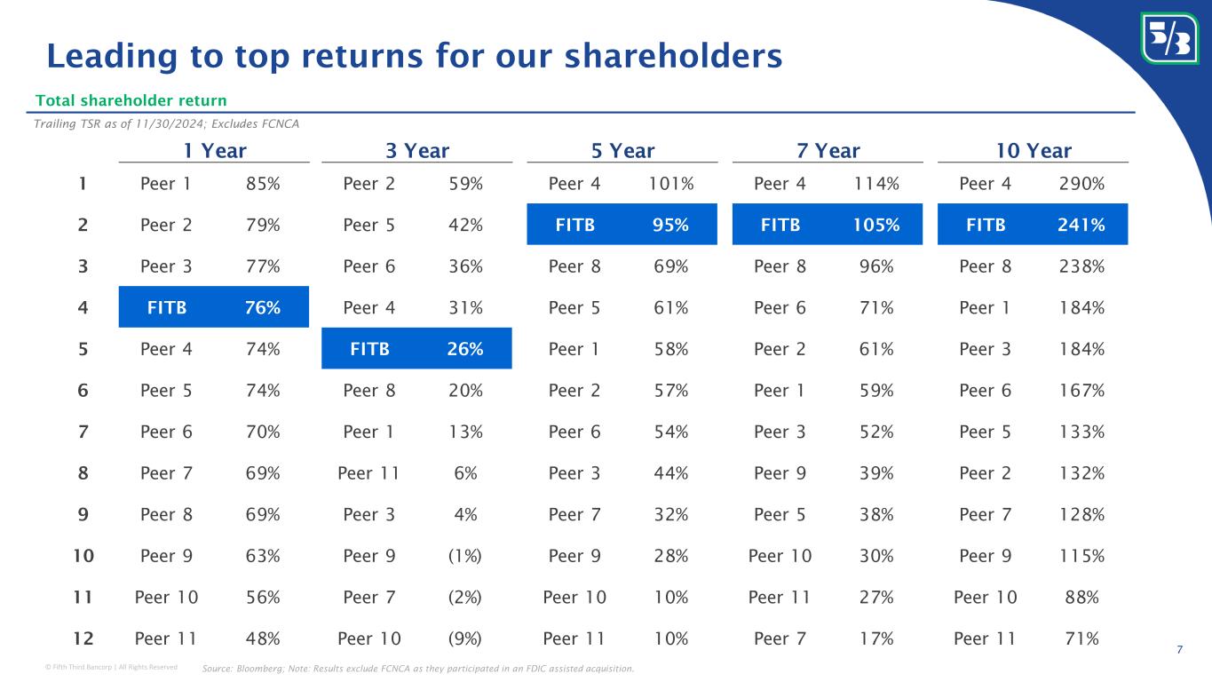 © Fifth Third Bancorp | All Rights Reserved 60.5% Peer 9 Peer 6 x Peer 10 Peer 8 Peer 7 Peer 3 Peer 4 Peer 11 Peer 1 Peer 2 Peer 5 14.0% Peer 1 Peer 2 Peer 3 Peer 4 Peer 5 Peer 6 Peer 7 Peer 8 Peer 9 x Peer 10 Peer 11 1.29% Peer 5 Peer 2 Peer 1 Peer 3 Peer 8 Peer 6 Peer 7 Peer 4 Peer 10 x Peer 9 Peer 11 Driving to consistently generate top quartile results 6 Return on tangible common equity 1,2 FY18 LTM 3Q24 FY18 FY18 Return on assets 1 Efficiency ratio 1 Adjusted basis Adjusted basis Adjusted basis Remain focused on long-term horizon Expect to continue generating top-tier financial results 3 LTM 3Q24 LTM 3Q24 1 Non-GAAP measure: see reconciliation and use of non-GAAP measures on pages 27-29 of the 3Q24 earnings release; 2 Return on tangible common equity excludes AOCI; Certain peers excluded due to limited data; 3 See forward-looking statements on page 2 of this presentation regarding forward-looking non-GAAP measures and use of non-GAAP measures on pages 27-29 of the 3Q24 earnings release 1.20% Peer 7 Peer 2 FITB Peer 8 Peer 9 Peer 1 Peer 4 Peer 5 Peer 10 Peer 3 Peer 11 Peer 6 14.6% Peer 7 FITB Peer 1 Peer 2 Peer 8 Peer 4 Peer 10 Peer 9 Peer 5 Peer 3 Peer 11 Peer 6 57.3% Peer 2 FITB Peer 7 Peer 3 Peer 9 Peer 8 Peer 1 Peer 4 Peer 10 Peer 11 Peer 5 Peer 6