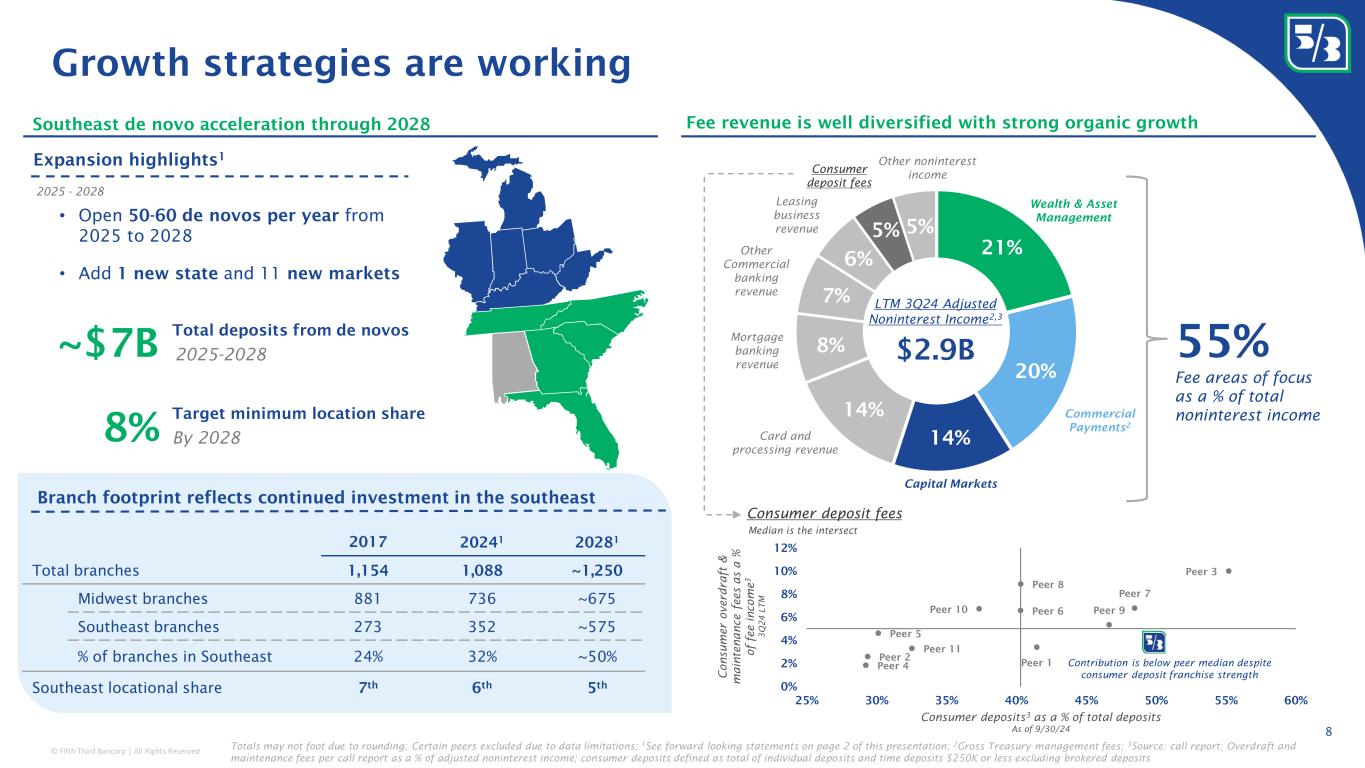 © Fifth Third Bancorp | All Rights Reserved Leading to top returns for our shareholders 7 Total shareholder return Source: Bloomberg; Note: Results exclude FCNCA as they participated in an FDIC assisted acquisition. Trailing TSR as of 11/30/2024; Excludes FCNCA 1 Year 3 Year 5 Year 7 Year 10 Year 1 Peer 1 85% Peer 2 59% Peer 4 101% Peer 4 114% Peer 4 290% 2 Peer 2 79% Peer 5 42% FITB 95% FITB 105% FITB 241% 3 Peer 3 77% Peer 6 36% Peer 8 69% Peer 8 96% Peer 8 238% 4 FITB 76% Peer 4 31% Peer 5 61% Peer 6 71% Peer 1 184% 5 Peer 4 74% FITB 26% Peer 1 58% Peer 2 61% Peer 3 184% 6 Peer 5 74% Peer 8 20% Peer 2 57% Peer 1 59% Peer 6 167% 7 Peer 6 70% Peer 1 13% Peer 6 54% Peer 3 52% Peer 5 133% 8 Peer 7 69% Peer 11 6% Peer 3 44% Peer 9 39% Peer 2 132% 9 Peer 8 69% Peer 3 4% Peer 7 32% Peer 5 38% Peer 7 128% 10 Peer 9 63% Peer 9 (1%) Peer 9 28% Peer 10 30% Peer 9 115% 11 Peer 10 56% Peer 7 (2%) Peer 10 10% Peer 11 27% Peer 10 88% 12 Peer 11 48% Peer 10 (9%) Peer 11 10% Peer 7 17% Peer 11 71%