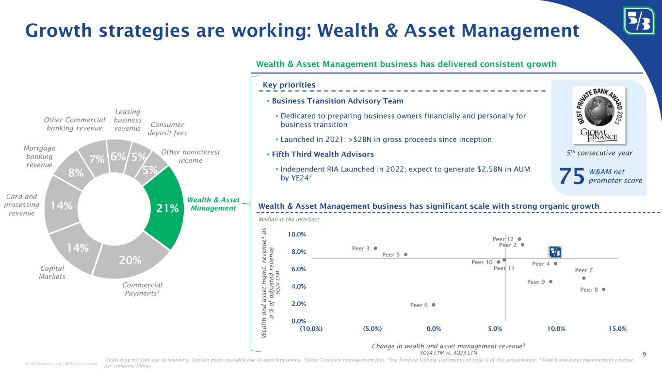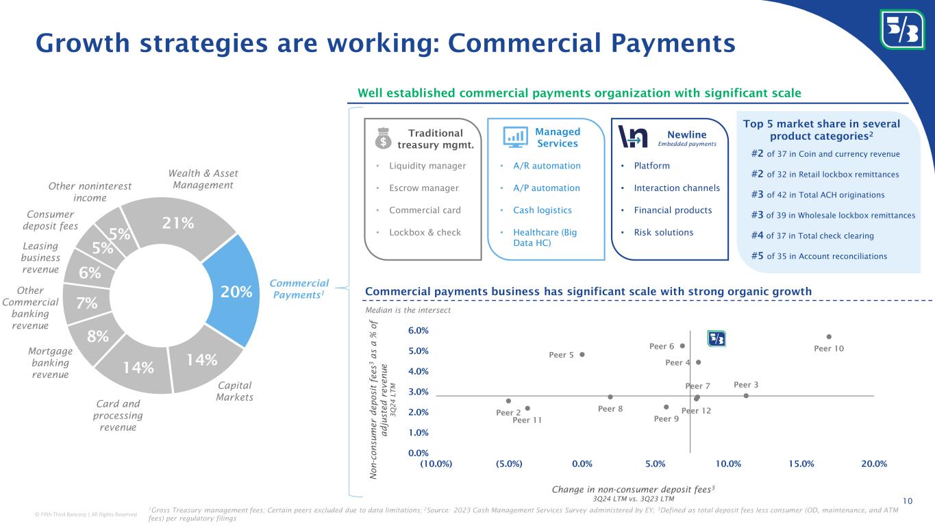 © Fifth Third Bancorp | All Rights Reserved Peer 2 Peer 3 Peer 4 Peer 5 Peer 6 Peer 7 Peer 8 Peer 9 Peer 10 Peer 11 Peer 12 0.0% 2.0% 4.0% 6.0% 8.0% 10.0% (10.0%) (5.0%) 0.0% 5.0% 10.0% 15.0% Growth strategies are working: Wealth & Asset Management 21% 20% 14% 14% 8% 7% 6% 5% 5% Wealth & Asset Management Card and processing revenue Mortgage banking revenue Leasing business revenue Other noninterest income Capital Markets Other Commercial banking revenue Commercial Payments 1 Consumer deposit fees Wealth & Asset Management business has delivered consistent growth Totals may not foot due to rounding; Certain peers excluded due to data limitations; 1 Gross Treasury management fees; 2 See forward looking statements on page 2 of this presentation; 3 Wealth and asset management revenue per company filings 5 th consecutive year • Business Transition Advisory Team • Dedicated to preparing business owners financially and personally for business transition • Launched in 2021; >$2BN in gross proceeds since inception • Fifth Third Wealth Advisors • Independent RIA Launched in 2022; expect to generate $2.5BN in AUM by YE24 2 75 W&AM net promoter score Key priorities W e a lt h a n d a s s e t m g m t . r e v e n u e 3 a s a % o f a d j u s t e d r e v e n u e 3 Q 2 4 L T M Change in wealth and asset management revenue 3 3Q24 LTM vs. 3Q23 LTM Wealth & Asset Management business has significant scale with strong organic growth Median is the intersect 9