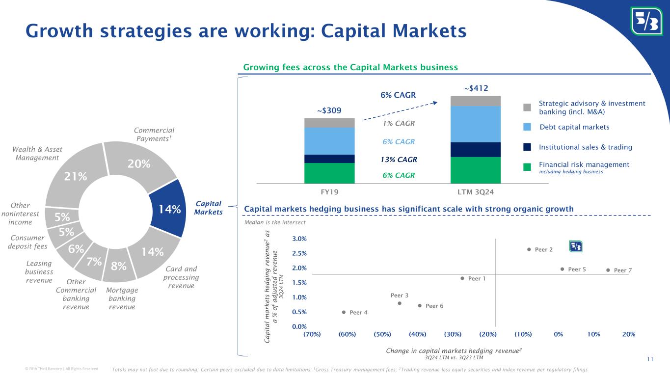 © Fifth Third Bancorp | All Rights Reserved Peer 2 Peer 3 Peer 4 Peer 5 Peer 6 Peer 7 Peer 8 Peer 9 Peer 10 Peer 11 Peer 12 0.0% 1.0% 2.0% 3.0% 4.0% 5.0% 6.0% (10.0%) (5.0%) 0.0% 5.0% 10.0% 15.0% 20.0% Growth strategies are working: Commercial Payments 10 Well established commercial payments organization with significant scale 1 Gross Treasury management fees; Certain peers excluded due to data limitations; 2 Source: 2023 Cash Management Services Survey administered by EY; 3 Defined as total deposit fees less consumer (OD, maintenance, and ATM fees) per regulatory filings #2 of 37 in Coin and currency revenue #2 of 32 in Retail lockbox remittances #3 of 42 in Total ACH originations #3 of 39 in Wholesale lockbox remittances #4 of 37 in Total check clearing #5 of 35 in Account reconciliations Top 5 market share in several product categories 2 21% 20% 14% 14% 8% 7% 6% 5% 5% Wealth & Asset Management Card and processing revenue Mortgage banking revenue Leasing business revenue Other noninterest income Capital Markets Other Commercial banking revenue Commercial Payments 1 Consumer deposit fees Traditional treasury mgmt. Managed Services Newline Embedded payments • Platform • Interaction channels • Financial products • Risk solutions • A/R automation • A/P automation • Cash logistics • Healthcare (Big Data HC) • Liquidity manager • Escrow manager • Commercial card • Lockbox & check N o n - c o n s u m e r d e p o s it f e e s 3 a s a % o f a d j u s t e d r e v e n u e 3 Q 2 4 L T M Change in non-consumer deposit fees 3 3Q24 LTM vs. 3Q23 LTM Commercial payments business has significant scale with strong organic growth Median is the intersect