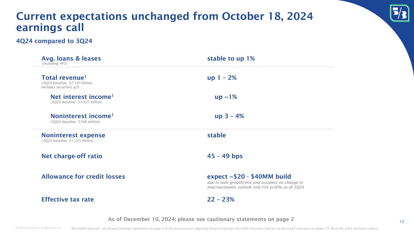 © Fifth Third Bancorp | All Rights Reserved Peer 1 Peer 2 Peer 3 Peer 4 Peer 5 Peer 6 Peer 7 0.0% 0.5% 1.0% 1.5% 2.0% 2.5% 3.0% (70%) (60%) (50%) (40%) (30%) (20%) (10%) 0% 10% 20% Growth strategies are working: Capital Markets 11 Growing fees across the Capital Markets business Totals may not foot due to rounding; Certain peers excluded due to data limitations; 1 Gross Treasury management fees; 2 Trading revenue less equity securities and index revenue per regulatory filings FY19 LTM 3Q24 ~$412 ~$309 6% CAGR 1% CAGR 6% CAGR 13% CAGR 6% CAGR Financial risk management including hedging business Strategic advisory & investment banking (incl. M&A) Institutional sales & trading Debt capital markets 21% 20% 14% 14% 8% 7% 6% 5% 5% Wealth & Asset Management Card and processing revenue Mortgage banking revenue Leasing business revenue Other noninterest income Other Commercial banking revenue Capital Markets Consumer deposit fees Commercial Payments 1 C a p it a l m a r k e t s h e d g in g r e v e n u e 2 a s a % o f a d j u s t e d r e v e n u e 3 Q 2 4 L T M Change in capital markets hedging revenue 2 3Q24 LTM vs. 3Q23 LTM Capital markets hedging business has significant scale with strong organic growth Median is the intersect
