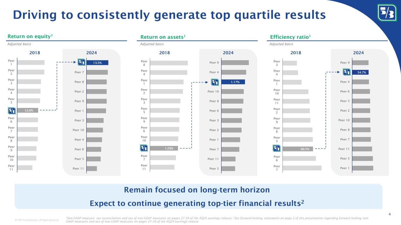 © Fifth Third Bancorp | All Rights Reserved 1.17% Peer 9 Peer 4 x Peer 10 Peer 8 Peer 6 Peer 3 Peer 2 Peer 1 Peer 7 Peer 11 Peer 5 54.7% Peer 9 x Peer 4 Peer 6 Peer 3 Peer 2 Peer 10 Peer 8 Peer 7 Peer 11 Peer 5 Peer 1 12.0% Peer 1 Peer 2 Peer 3 Peer 4 Peer 5 X Peer 6 Peer 7 Peer 8 Peer 9 Peer 10 Peer 11 13.5%x Peer 7 Peer 8 Peer 2 Peer 9 Peer 1 Peer 3 Peer 10 Peer 4 Peer 6 Peer 5 Peer 11 60.5% Peer 7 Peer 6 x Peer 5 Peer 8 Peer 9 Peer 2 Peer 11 Peer 10 Peer 1 Peer 4 Peer 3 1.29% Peer 8 Peer 4 Peer 1 Peer 2 Peer 3 Peer 5 Peer 9 Peer 6 Peer 10 x Peer 7 Peer 11 Driving to consistently generate top quartile results 4 Return on equity 1 2018 2024 2018 2018 Return on assets 1 Efficiency ratio 1 Adjusted basis Adjusted basis Adjusted basis Remain focused on long-term horizon Expect to continue generating top-tier financial results 2 2024 2024 1 Non-GAAP measure: see reconciliation and use of non-GAAP measures on pages 27-29 of the 4Q24 earnings release; 2 See forward-looking statements on page 2 of this presentation regarding forward-looking non- GAAP measures and use of non-GAAP measures on pages 27-29 of the 4Q24 earnings release