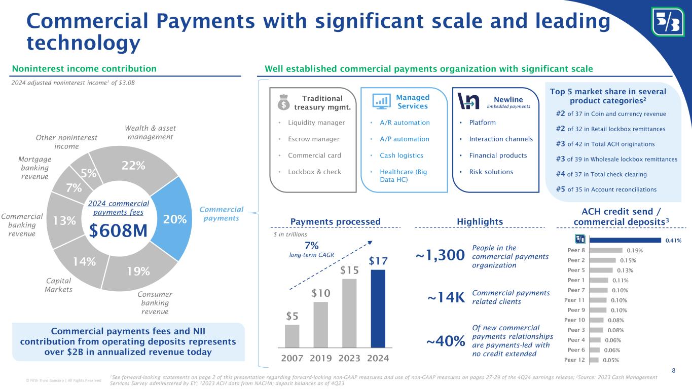 © Fifth Third Bancorp | All Rights Reserved This presentation contains statements that we believe are “forward-looking statements” within the meaning of Section 27A of the Securities Act of 1933, as amended, and Rule 175 promulgated thereunder, and Section 21E of the Securities Exchange Act of 1934, as amended, and Rule 3b-6 promulgated thereunder. All statements other than statements of historical fact are forward-looking statements. These statements relate to our financial condition, results of operations, plans, objectives, future performance, capital actions or business. They usually can be identified by the use of forward-looking language such as “will likely result,” “may,” “are expected to,” “is anticipated,” “potential,” “estimate,” “forecast,” “projected,” “intends to,” or may include other similar words or phrases such as “believes,” “plans,” “trend,” “objective,” “continue,” “remain,” or similar expressions, or future or conditional verbs such as “will,” “would,” “should,” “could,” “might,” “can,” or similar verbs. You should not place undue reliance on these statements, as they are subject to risks and uncertainties, including but not limited to the risk factors set forth in our most recent Annual Report on Form 10-K as updated by our filings with the U.S. Securities and Exchange Commission (“SEC”). There are a number of important factors that could cause future results to differ materially from historical performance and these forward-looking statements. Factors that might cause such a difference include, but are not limited to: (1) deteriorating credit quality; (2) loan concentration by location or industry of borrowers or collateral; (3) problems encountered by other financial institutions; (4) inadequate sources of funding or liquidity; (5) unfavorable actions of rating agencies; (6) inability to maintain or grow deposits; (7) limitations on the ability to receive dividends from subsidiaries; (8) cyber-security risks; (9) Fifth Third’s ability to secure confidential information and deliver products and services through the use of computer systems and telecommunications networks; (10) failures by third-party service providers; (11) inability to manage strategic initiatives and/or organizational changes; (12) inability to implement technology system enhancements, including the use of artificial intelligence; (13) failure of internal controls and other risk management programs; (14) losses related to fraud, theft, misappropriation or violence; (15) inability to attract and retain skilled personnel; (16) adverse impacts of government regulation; (17) governmental or regulatory changes or other actions; (18) failures to meet applicable capital requirements; (19) regulatory objections to Fifth Third’s capital plan; (20) regulation of Fifth Third’s derivatives activities; (21) deposit insurance premiums; (22) assessments for the orderly liquidation fund; (23) weakness in the national or local economies; (24) global political and economic uncertainty or negative actions; (25) changes in interest rates and the effects of inflation; (26) changes and trends in capital markets; (27) fluctuation of Fifth Third’s stock price; (28) volatility in mortgage banking revenue; (29) litigation, investigations, and enforcement proceedings; (30) breaches of contractual covenants, representations and warranties; (31) competition and changes in the financial services industry; (32) potential impacts of the adoption of real-time payment networks; (33) changing retail distribution strategies, customer preferences and behavior; (34) difficulties in identifying, acquiring or integrating suitable strategic partnerships, investments or acquisitions; (35) potential dilution from future acquisitions; (36) loss of income and/or difficulties encountered in the sale and separation of businesses, investments or other assets; (37) results of investments or acquired entities; (38) changes in accounting standards or interpretation or declines in the value of Fifth Third’s goodwill or other intangible assets; (39) inaccuracies or other failures from the use of models; (40) effects of critical accounting policies and judgments or the use of inaccurate estimates; (41) weather-related events, other natural disasters, or health emergencies (including pandemics); (42) the impact of reputational risk created by these or other developments on such matters as business generation and retention, funding and liquidity; (43) changes in law or requirements imposed by Fifth Third’s regulators impacting our capital actions, including dividend payments and stock repurchases; and (44) Fifth Third's ability to meet its environmental and/or social targets, goals and commitments. You should refer to our periodic and current reports filed with the Securities and Exchange Commission, or “SEC,” for further information on other factors, which could cause actual results to be significantly different from those expressed or implied by these forward-looking statements. Moreover, you should treat these statements as speaking only as of the date they are made and based only on information then actually known to us. We expressly disclaim any obligation or undertaking to release publicly any updates or revisions to any forward-looking statements contained herein to reflect any change in our expectations or any changes in events, conditions or circumstances on which any such statement is based, except as may be required by law, and we claim the protection of the safe harbor for forward-looking statements contained in the Private Securities Litigation Reform Act of 1995. The information contained herein is intended to be reviewed in its totality, and any stipulations, conditions or provisos that apply to a given piece of information in one part of this press release should be read as applying mutatis mutandis to every other instance of su