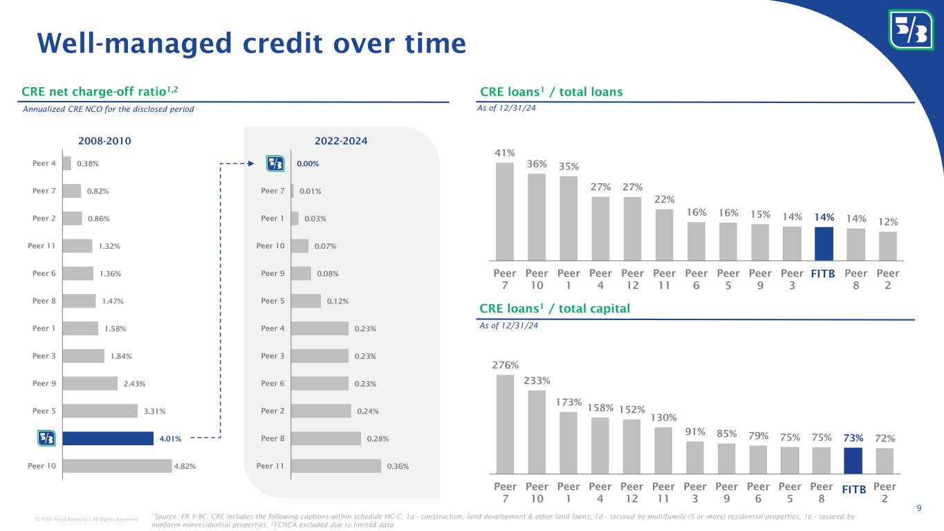 © Fifth Third Bancorp | All Rights Reserved Commercial Payments with significant scale and leading technology 8 Well established commercial payments organization with significant scale 1 See forward-looking statements on page 2 of this presentation regarding forward-looking non-GAAP measures and use of non-GAAP measures on pages 27-29 of the 4Q24 earnings release; 2 Source: 2023 Cash Management Services Survey administered by EY; 3 2023 ACH data from NACHA; deposit balances as of 4Q23 #2 of 37 in Coin and currency revenue #2 of 32 in Retail lockbox remittances #3 of 42 in Total ACH originations #3 of 39 in Wholesale lockbox remittances #4 of 37 in Total check clearing #5 of 35 in Account reconciliations Top 5 market share in several product categories 2 22% 20% 19% 14% 13% 7% 5% Wealth & asset management Mortgage banking revenue Other noninterest income Capital Markets Commercial banking revenue Commercial payments Consumer banking revenue Traditional treasury mgmt. Managed Services Newline Embedded payments • Platform • Interaction channels • Financial products • Risk solutions • A/R automation • A/P automation • Cash logistics • Healthcare (Big Data HC) • Liquidity manager • Escrow manager • Commercial card • Lockbox & check 0.05% 0.06% 0.06% 0.08% 0.08% 0.10% 0.10% 0.10% 0.11% 0.13% 0.15% 0.19% 0.41% Peer 12 Peer 6 Peer 4 Peer 3 Peer 10 Peer 9 Peer 11 Peer 7 Peer 1 Peer 5 Peer 2 Peer 8 x HighlightsPayments processed ACH credit send / commercial deposits 3 ~1,300 People in the commercial payments organization ~14K Commercial payments related clients ~40% Of new commercial payments relationships are payments-led with no credit extended $5 $10 $15 $17 2007 2019 2023 2024 $ in trillions 2024 commercial payments fees $608M Commercial payments fees and NII contribution from operating deposits represents over $2B in annualized revenue today Noninterest income contribution 2024 adjusted noninterest income 1 of $3.0B 7% long-term CAGR