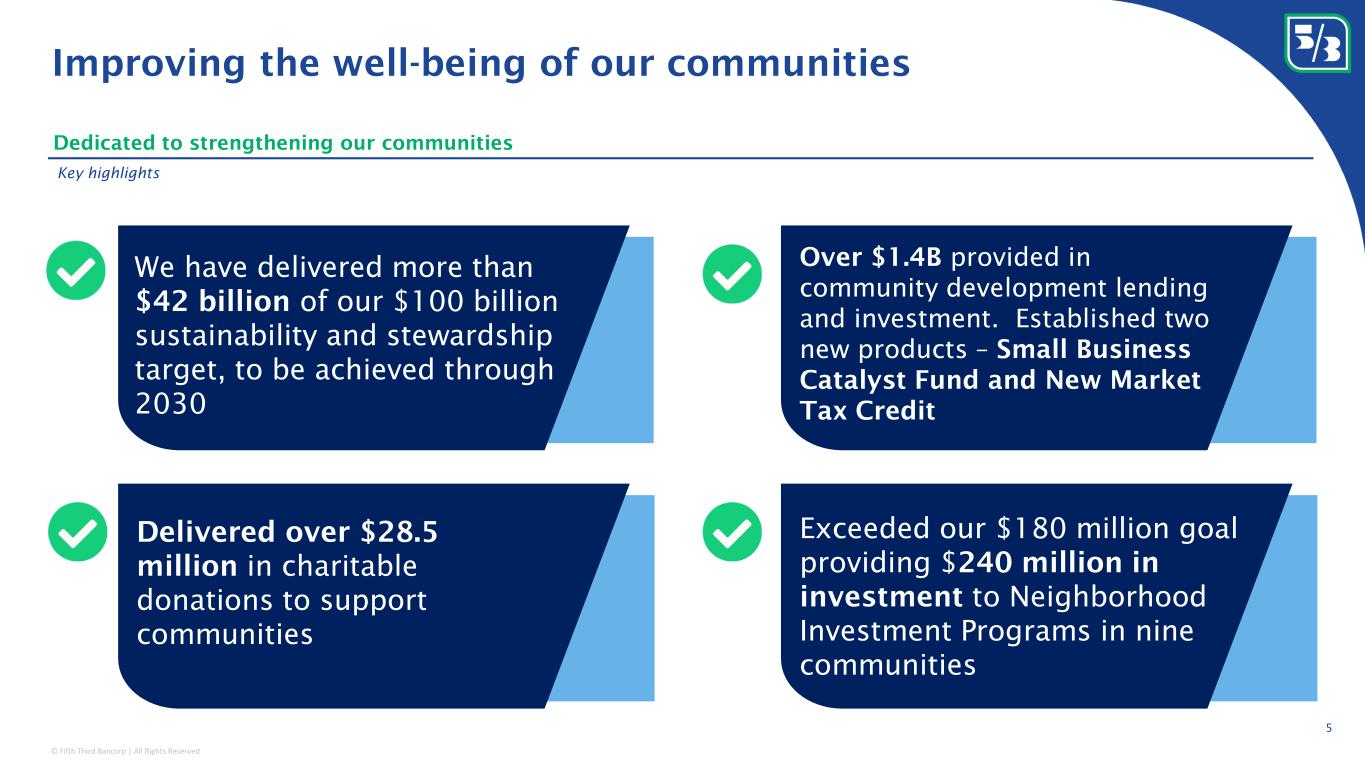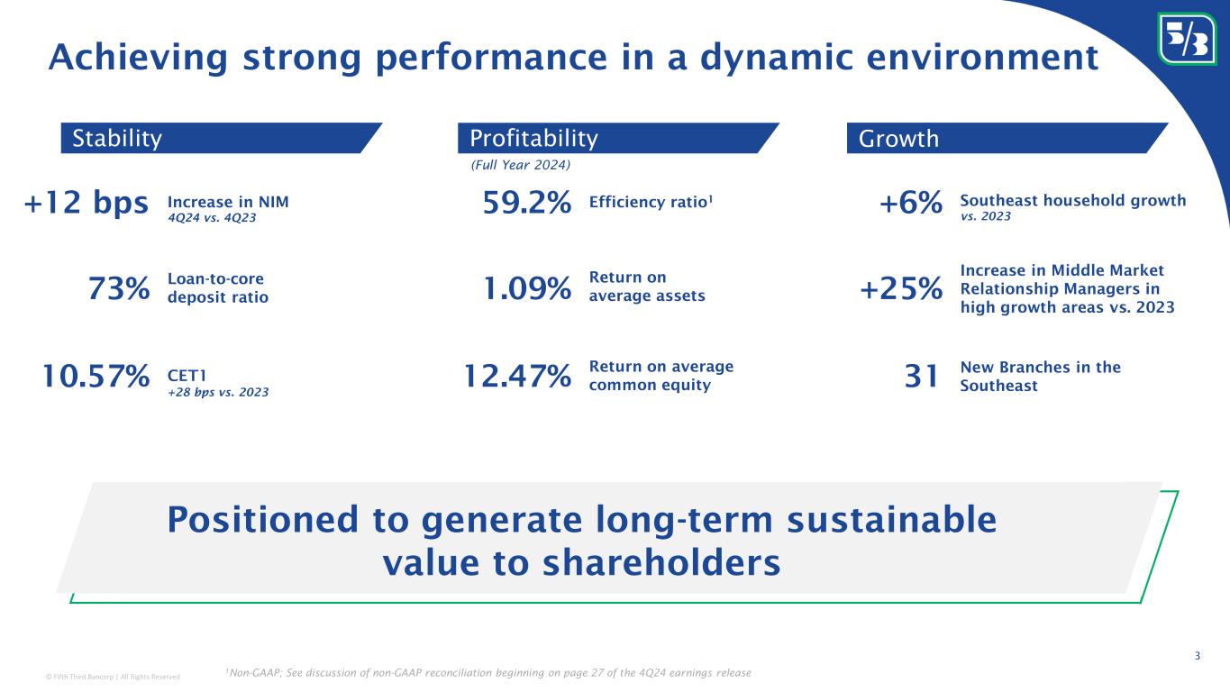 © Fifth Third Bancorp | All Rights Reserved Cautionary statement This presentation contains statements that we believe are “forward-looking statements” within the meaning of Section 27A of the Securities Act of 1933, as amended, and Rule 175 promulgated thereunder, and Section 21E of the Securities Exchange Act of 1934, as amended, and Rule 3b-6 promulgated thereunder. All statements other than statements of historical fact are forward-looking statements. These statements relate to our financial condition, results of operations, plans, objectives, future performance, capital actions or business. They usually can be identified by the use of forward-looking language such as “will likely result,” “may,” “are expected to,” “is anticipated,” “potential,” “estimate,” “forecast,” “projected,” “intends to,” or may include other similar words or phrases such as “believes,” “plans,” “trend,” “objective,” “continue,” “remain,” or similar expressions, or future or conditional verbs such as “will,” “would,” “should,” “could,” “might,” “can,” or similar verbs. You should not place undue reliance on these statements, as they are subject to risks and uncertainties, including but not limited to the risk factors set forth in our most recent Annual Report on Form 10-K as updated by our filings with the U.S. Securities and Exchange Commission (“SEC”). There are a number of important factors that could cause future results to differ materially from historical performance and these forward-looking statements. Factors that might cause such a difference include, but are not limited to: (1) deteriorating credit quality; (2) loan concentration by location or industry of borrowers or collateral; (3) problems encountered by other financial institutions; (4) inadequate sources of funding or liquidity; (5) unfavorable actions of rating agencies; (6) inability to maintain or grow deposits; (7) limitations on the ability to receive dividends from subsidiaries; (8) cyber-security risks; (9) Fifth Third’s ability to secure confidential information and deliver products and services through the use of computer systems and telecommunications networks; (10) failures by third-party service providers; (11) inability to manage strategic initiatives and/or organizational changes; (12) inability to implement technology system enhancements, including the use of artificial intelligence; (13) failure of internal controls and other risk management programs; (14) losses related to fraud, theft, misappropriation or violence; (15) inability to attract and retain skilled personnel; (16) adverse impacts of government regulation; (17) governmental or regulatory changes or other actions; (18) failures to meet applicable capital requirements; (19) regulatory objections to Fifth Third’s capital plan; (20) regulation of Fifth Third’s derivatives activities; (21) deposit insurance premiums; (22) assessments for the orderly liquidation fund; (23) weakness in the national or local economies; (24) global political and economic uncertainty or negative actions; (25) changes in interest rates and the effects of inflation; (26) changes and trends in capital markets; (27) fluctuation of Fifth Third’s stock price; (28) volatility in mortgage banking revenue; (29) litigation, investigations, and enforcement proceedings; (30) breaches of contractual covenants, representations and warranties; (31) competition and changes in the financial services industry; (32) potential impacts of the adoption of real-time payment networks; (33) changing retail distribution strategies, customer preferences and behavior; (34) difficulties in identifying, acquiring or integrating suitable strategic partnerships, investments or acquisitions; (35) potential dilution from future acquisitions; (36) loss of income and/or difficulties encountered in the sale and separation of businesses, investments or other assets; (37) results of investments or acquired entities; (38) changes in accounting standards or interpretation or declines in the value of Fifth Third’s goodwill or other intangible assets; (39) inaccuracies or other failures from the use of models; (40) effects of critical accounting policies and judgments or the use of inaccurate estimates; (41) weather-related events, other natural disasters, or health emergencies (including pandemics); (42) the impact of reputational risk created by these or other developments on such matters as business generation and retention, funding and liquidity; (43) changes in law or requirements imposed by Fifth Third’s regulators impacting our capital actions, including dividend payments and stock repurchases; and (44) Fifth Third’s ability to meet its environmental and/or social targets, goals and commitments. You should refer to our periodic and current reports filed with the Securities and Exchange Commission, or “SEC,” for further information on other factors, which could cause actual results to be significantly different from those expressed or implied by these forward-looking statements. Moreover, you should treat these statements as speaking only as of the date they are made and based only on information then actually known to us. We expressly disclaim any obligation or undertaking to release publicly any updates or revisions to any forward-looking statements contained herein to reflect any change in our expectations or any changes in events, conditions or circumstances on which any such statement is based, except as may be required by law, and we claim the protection of the safe harbor for forward-looking statements contained in the Private Securities Litigation Reform Act of 1995. The information contained herein is intended to be reviewed in its totality, and any stipulations, conditions or provisos that apply to a given piece of information in one part of this press release should be read as applying mutatis mutandis to eve