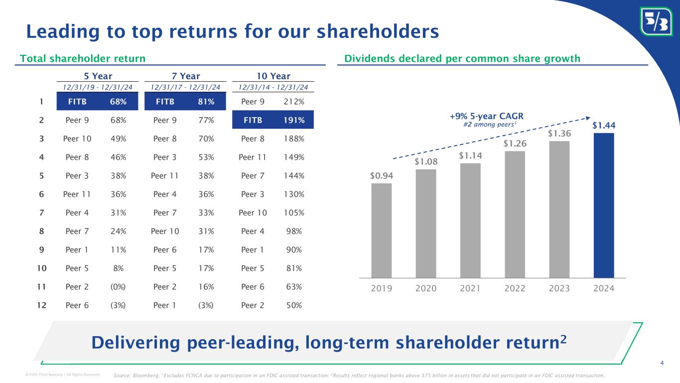 © Fifth Third Bancorp | All Rights Reserved $0.94 $1.08 $1.14 $1.26 $1.36 $1.44 2019 2020 2021 2022 2023 2024 Leading to top returns for our shareholders Total shareholder return Source: Bloomberg; 1 Excludes FCNCA due to participation in an FDIC assisted transaction; 2 Results reflect regional banks above $75 billion in assets that did not participate in an FDIC assisted transaction. 0 Delivering peer-leading, long-term shareholder return 2 Dividends declared per common share growth +9% 5-year CAGR #2 among peers 1 4 5 Year 7 Year 10 Year 12/31/19 - 12/31/24 12/31/17 - 12/31/24 12/31/14 - 12/31/24 1 FITB 68% FITB 81% Peer 9 212% 2 Peer 9 68% Peer 9 77% FITB 191% 3 Peer 10 49% Peer 8 70% Peer 8 188% 4 Peer 8 46% Peer 3 53% Peer 11 149% 5 Peer 3 38% Peer 11 38% Peer 7 144% 6 Peer 11 36% Peer 4 36% Peer 3 130% 7 Peer 4 31% Peer 7 33% Peer 10 105% 8 Peer 7 24% Peer 10 31% Peer 4 98% 9 Peer 1 11% Peer 6 17% Peer 1 90% 10 Peer 5 8% Peer 5 17% Peer 5 81% 11 Peer 2 (0%) Peer 2 16% Peer 6 63% 12 Peer 6 (3%) Peer 1 (3%) Peer 2 50%