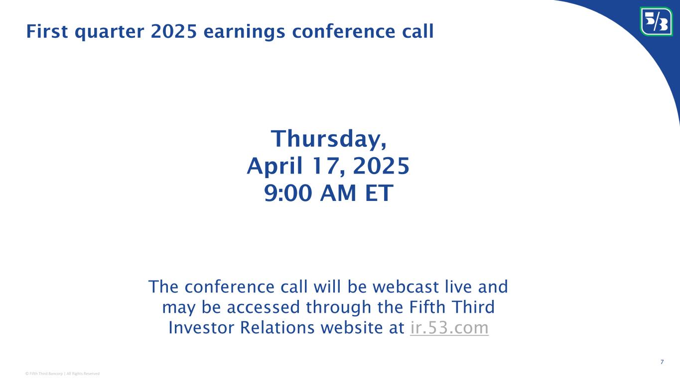 © Fifth Third Bancorp | All Rights Reserved Thursday, April 17, 2025 9:00 AM ET First quarter 2025 earnings conference call The conference call will be webcast live and may be accessed through the Fifth Third Investor Relations website at ir.53.com 7