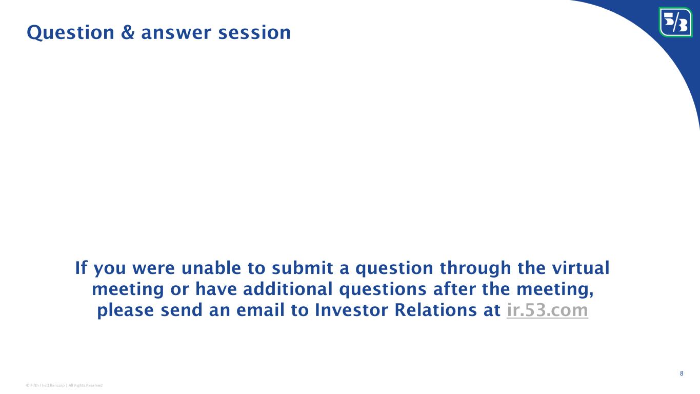 © Fifth Third Bancorp | All Rights Reserved If you were unable to submit a question through the virtual meeting or have additional questions after the meeting, please send an email to Investor Relations at ir.53.com Question & answer session 8