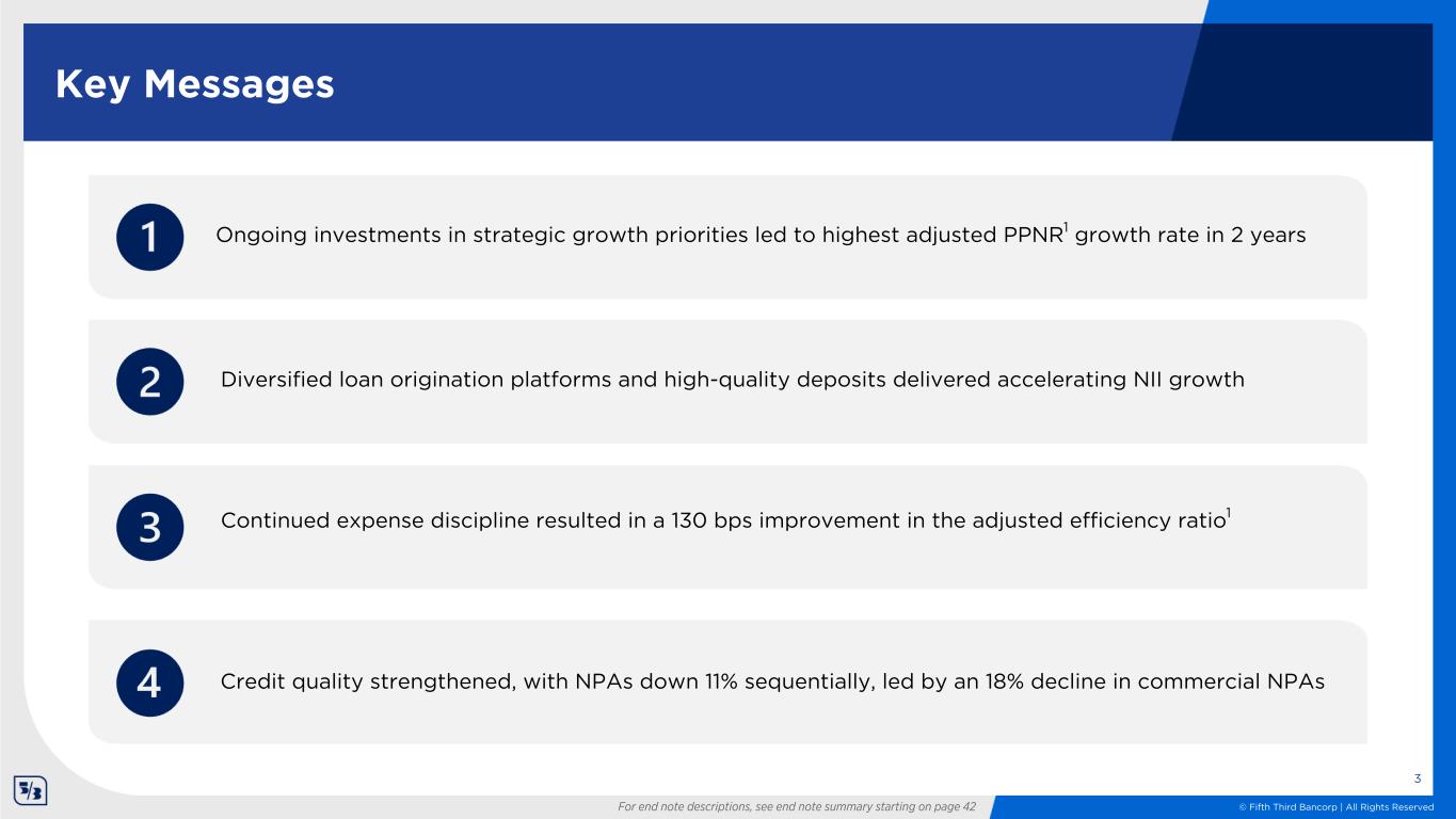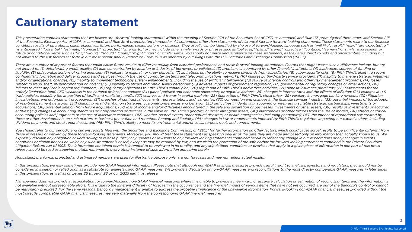 © Fifth Third Bancorp | All Rights Reserved This presentation contains statements that we believe are “forward-looking statements” within the meaning of Section 27A of the Securities Act of 1933, as amended, and Rule 175 promulgated thereunder, and Section 21E of the Securities Exchange Act of 1934, as amended, and Rule 3b-6 promulgated thereunder. All statements other than statements of historical fact are forward-looking statements. These statements relate to our financial condition, results of operations, plans, objectives, future performance, capital actions or business. They usually can be identified by the use of forward-looking language such as “will likely result,” “may,” “are expected to,” “is anticipated,” “potential,” “estimate,” “forecast,” “projected,” “intends to,” or may include other similar words or phrases such as “believes,” “plans,” “trend,” “objective,” “continue,” “remain,” or similar expressions, or future or conditional verbs such as “will,” “would,” “should,” “could,” “might,” “can,” or similar verbs. You should not place undue reliance on these statements, as they are subject to risks and uncertainties, including but not limited to the risk factors set forth in our most recent Annual Report on Form 10-K as updated by our filings with the U.S. Securities and Exchange Commission (“SEC”). There are a number of important factors that could cause future results to differ materially from historical performance and these forward-looking statements. Factors that might cause such a difference include, but are not limited to: (1) deteriorating credit quality; (2) loan concentration by location or industry of borrowers or collateral; (3) problems encountered by other financial institutions; (4) inadequate sources of funding or liquidity; (5) unfavorable actions of rating agencies; (6) inability to maintain or grow deposits; (7) limitations on the ability to receive dividends from subsidiaries; (8) cyber-security risks; (9) Fifth Third’s ability to secure confidential information and deliver products and services through the use of computer systems and telecommunications networks; (10) failures by third-party service providers; (11) inability to manage strategic initiatives and/or organizational changes; (12) inability to implement technology system enhancements, including the use of artificial intelligence; (13) failure of internal controls and other risk management programs; (14) losses related to fraud, theft, misappropriation or violence; (15) inability to attract and retain skilled personnel; (16) adverse impacts of government regulation; (17) governmental or regulatory changes or other actions; (18) failures to meet applicable capital requirements; (19) regulatory objections to Fifth Third’s capital plan; (20) regulation of Fifth Third’s derivatives activities; (21) deposit insurance premiums; (22) assessments for the orderly liquidation fund; (23) weakness in the national or local economies; (24) global political and economic uncertainty or negative actions; (25) changes in interest rates and the effects of inflation; (26) changes in U.S. trade policies, including the imposition of tariffs and retaliatory tariffs; (27) changes and trends in capital markets; (28) fluctuation of Fifth Third’s stock price; (29) volatility in mortgage banking revenue; (30) litigation, investigations, and enforcement proceedings; (31) breaches of contractual covenants, representations and warranties; (32) competition and changes in the financial services industry; (33) potential impacts of the adoption of real-time payment networks; (34) changing retail distribution strategies, customer preferences and behavior; (35) difficulties in identifying, acquiring or integrating suitable strategic partnerships, investments or acquisitions; (36) potential dilution from future acquisitions; (37) loss of income and/or difficulties encountered in the sale and separation of businesses, investments or other assets; (38) results of investments or acquired entities; (39) changes in accounting standards or interpretation or declines in the value of Fifth Third’s goodwill or other intangible assets; (40) inaccuracies or other failures from the use of models; (41) effects of critical accounting policies and judgments or the use of inaccurate estimates; (42) weather-related events, other natural disasters, or health emergencies (including pandemics); (43) the impact of reputational risk created by these or other developments on such matters as business generation and retention, funding and liquidity; (44) changes in law or requirements imposed by Fifth Third’s regulators impacting our capital actions, including dividend payments and stock repurchases; and (45) Fifth Third's ability to meet its environmental and/or social targets, goals and commitments. You should refer to our periodic and current reports filed with the Securities and Exchange Commission, or “SEC,” for further information on other factors, which could cause actual results to be significantly different from those expressed or implied by these forward-looking statements. Moreover, you should treat these statements as speaking only as of the date they are made and based only on information then actually known to us. We expressly disclaim any obligation or undertaking to release publicly any updates or revisions to any forward-looking statements contained herein to reflect any change in our expectations or any changes in events, conditions or circumstances on which any such statement is based, except as may be required by law, and we claim the protection of the safe harbor for forward-looking statements contained in the Private Securities Litigation Reform Act of 1995. The information contained herein is intended to be reviewed in its totality, and any stipulations, conditions or provisos that apply to a given piece of information in one pa