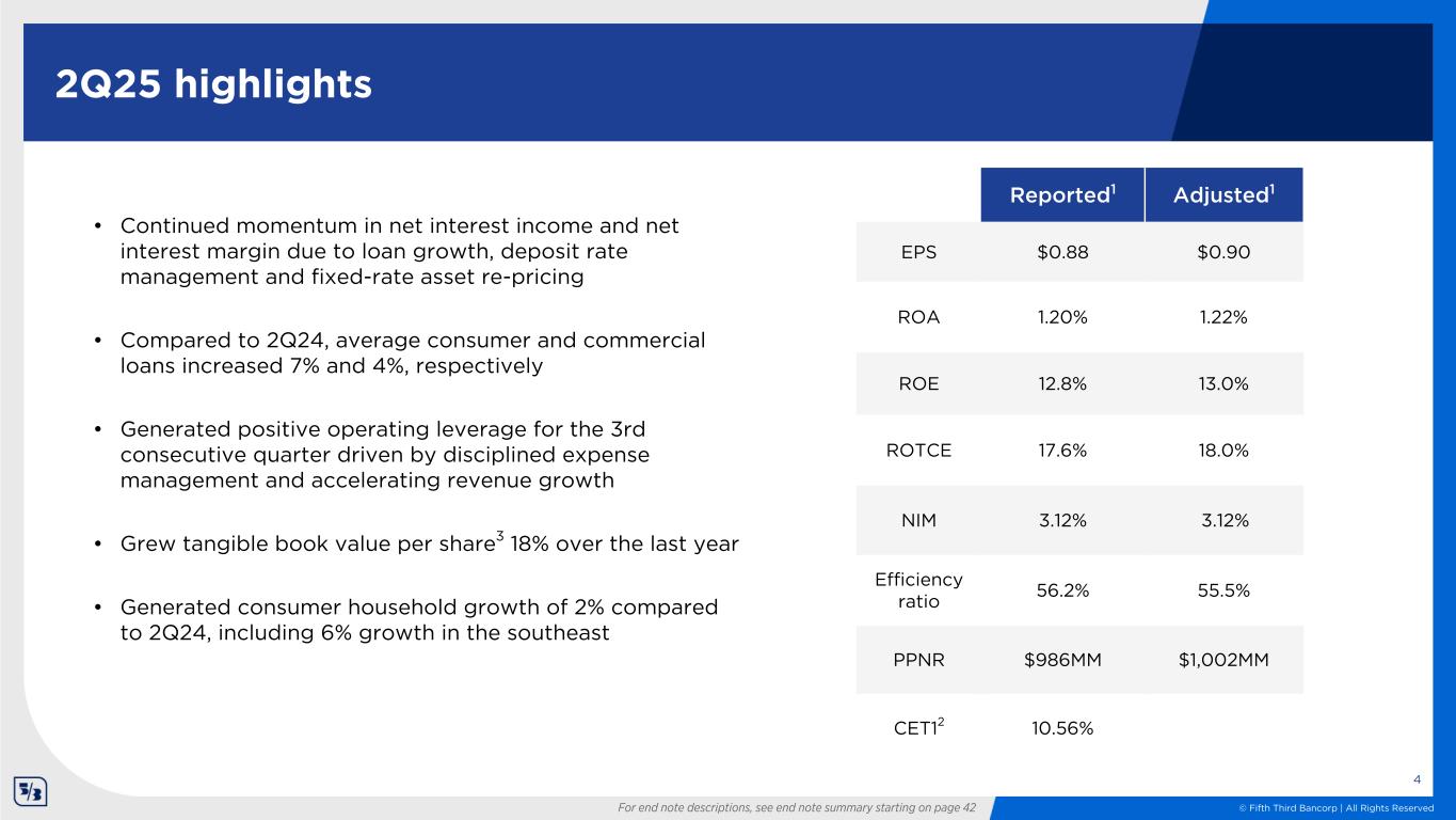 © Fifth Third Bancorp | All Rights Reserved For end note descriptions, see end note summary starting on page 42 Key Messages 3 Diversified loan origination platforms and high-quality deposits delivered accelerating NII growth Ongoing investments in strategic growth priorities led to highest adjusted PPNR1 growth rate in 2 years Continued expense discipline resulted in a 130 bps improvement in the adjusted efficiency ratio1 Credit quality strengthened, with NPAs down 11% sequentially, led by an 18% decline in commercial NPAs