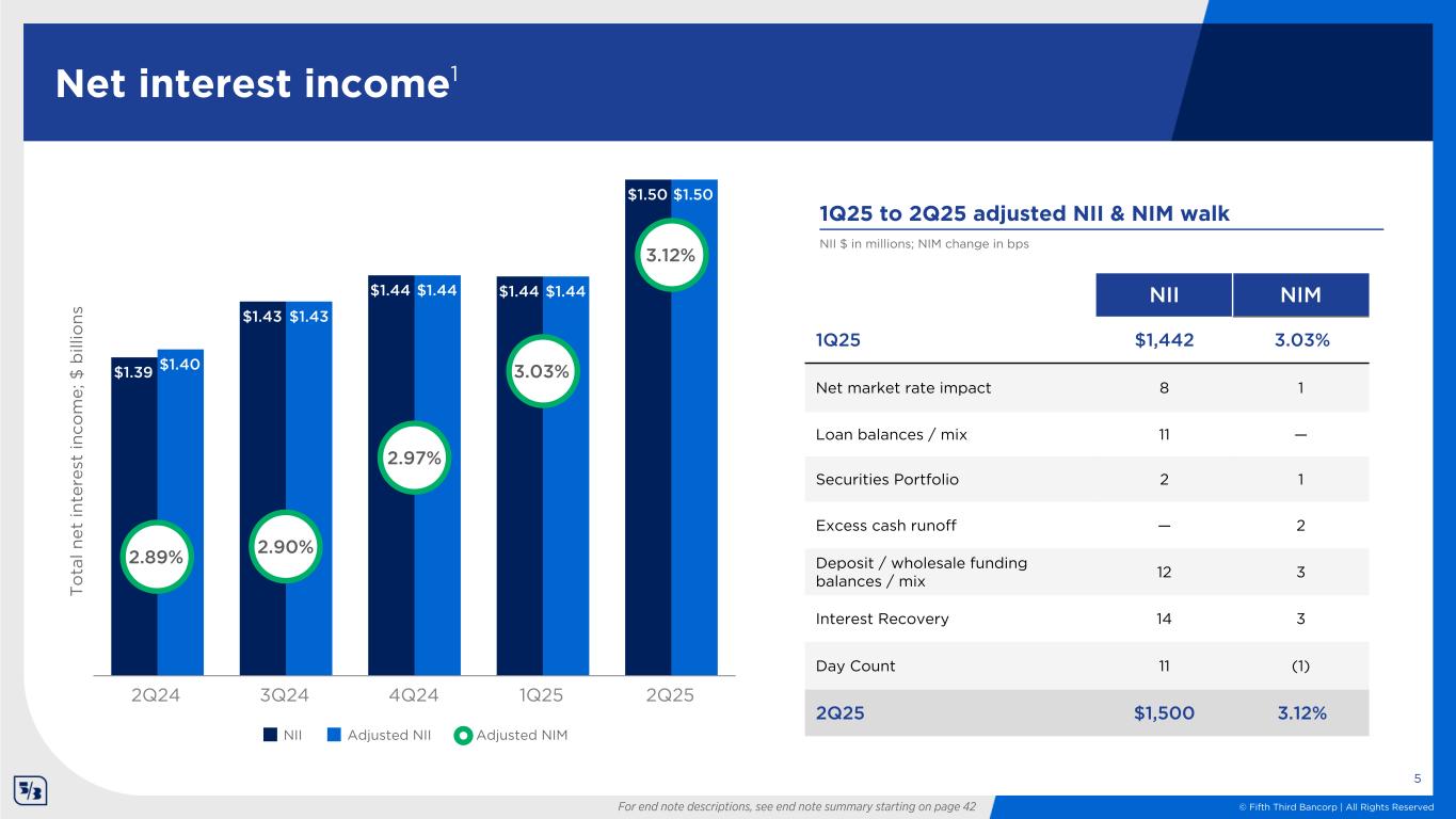 © Fifth Third Bancorp | All Rights Reserved • Continued momentum in net interest income and net interest margin due to loan growth, deposit rate management and fixed-rate asset re-pricing • Compared to 2Q24, average consumer and commercial loans increased 7% and 4%, respectively • Generated positive operating leverage for the 3rd consecutive quarter driven by disciplined expense management and accelerating revenue growth • Grew tangible book value per share3 18% over the last year • Generated consumer household growth of 2% compared to 2Q24, including 6% growth in the southeast Reported1 Adjusted1 EPS $0.88 $0.90 ROA 1.20% 1.22% ROE 12.8% 13.0% ROTCE 17.6% 18.0% NIM 3.12% 3.12% Efficiency ratio 56.2% 55.5% PPNR $986MM $1,002MM CET12 10.56% For end note descriptions, see end note summary starting on page 42 2Q25 highlights 4
