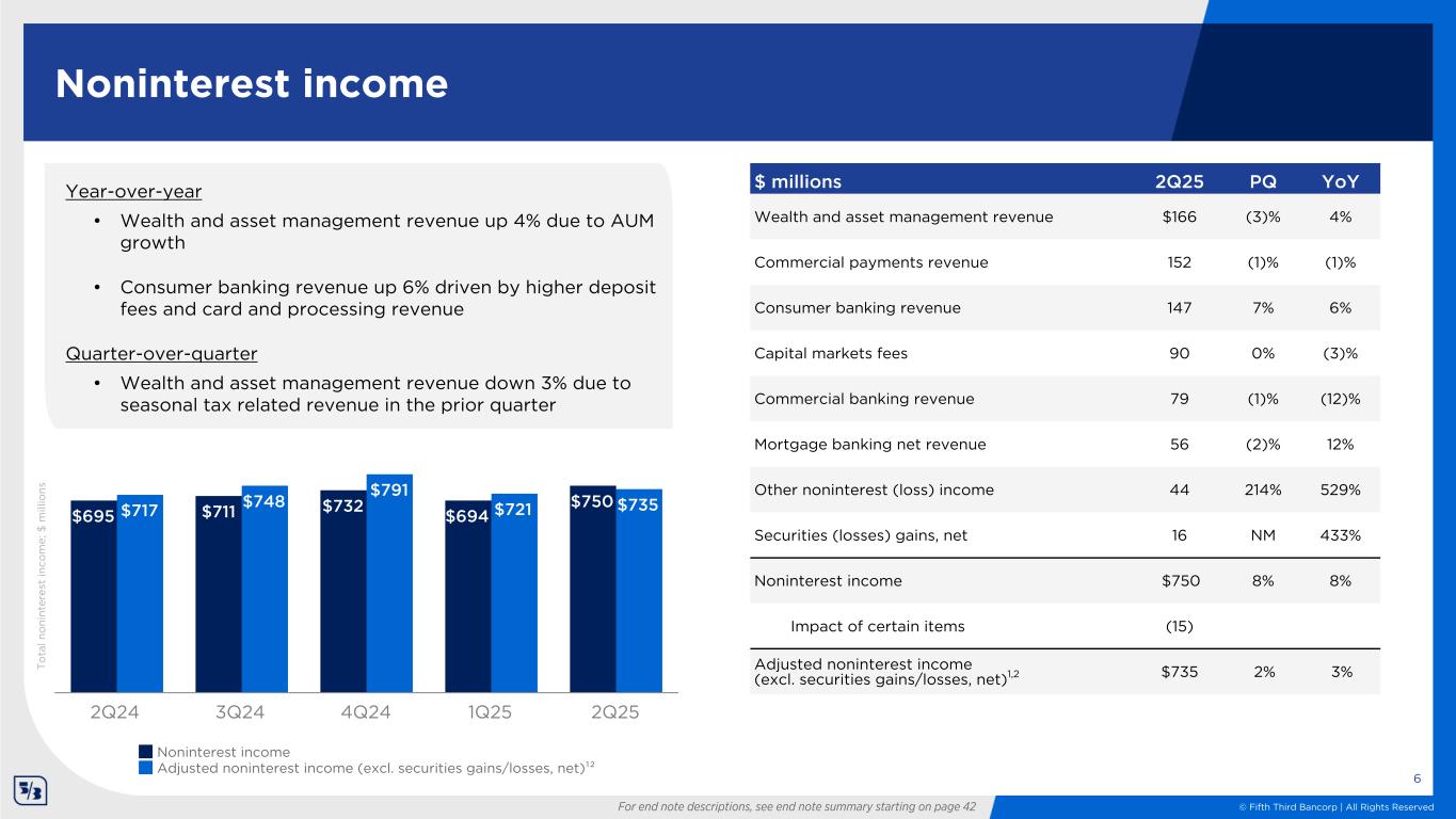 © Fifth Third Bancorp | All Rights Reserved $1.39 $1.43 $1.44 $1.44 $1.50 $1.40 $1.43 $1.44 $1.44 $1.50 2.89% 2.90% 2.97% 3.03% 3.12% NII Adjusted NII Adjusted NIM 2Q24 3Q24 4Q24 1Q25 2Q25 NII $ in millions; NIM change in bps 1Q25 to 2Q25 adjusted NII & NIM walk T o ta l n et in te re st in co m e; $ b ill io ns Net interest income1 5 For end note descriptions, see end note summary starting on page 42 NII NIM 1Q25 $1,442 3.03% Net market rate impact 8 1 Loan balances / mix 11 — Securities Portfolio 2 1 Excess cash runoff — 2 Deposit / wholesale funding balances / mix 12 3 Interest Recovery 14 3 Day Count 11 (1) 2Q25 $1,500 3.12%