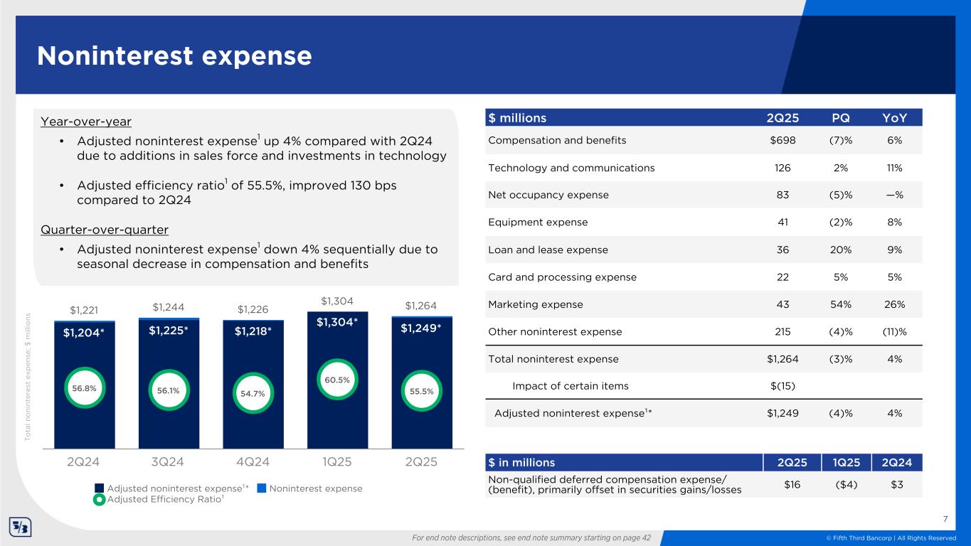 © Fifth Third Bancorp | All Rights Reserved Noninterest income T o ta l n o ni nt er es t in co m e; $ m ill io ns For end note descriptions, see end note summary starting on page 42 6 $ millions 2Q25 PQ YoY Wealth and asset management revenue $166 (3)% 4% Commercial payments revenue 152 (1)% (1)% Consumer banking revenue 147 7% 6% Capital markets fees 90 0% (3)% Commercial banking revenue 79 (1)% (12)% Mortgage banking net revenue 56 (2)% 12% Other noninterest (loss) income 44 214% 529% Securities (losses) gains, net 16 NM 433% Noninterest income $750 8% 8% Impact of certain items (15) Adjusted noninterest income (excl. securities gains/losses, net)1,2 $735 2% 3% Year-over-year • Wealth and asset management revenue up 4% due to AUM growth • Consumer banking revenue up 6% driven by higher deposit fees and card and processing revenue Quarter-over-quarter • Wealth and asset management revenue down 3% due to seasonal tax related revenue in the prior quarter $695 $711 $732 $694 $750$717 $748 $791 $721 $735 Noninterest income Adjusted noninterest income (excl. securities gains/losses, net)¹² 2Q24 3Q24 4Q24 1Q25 2Q25