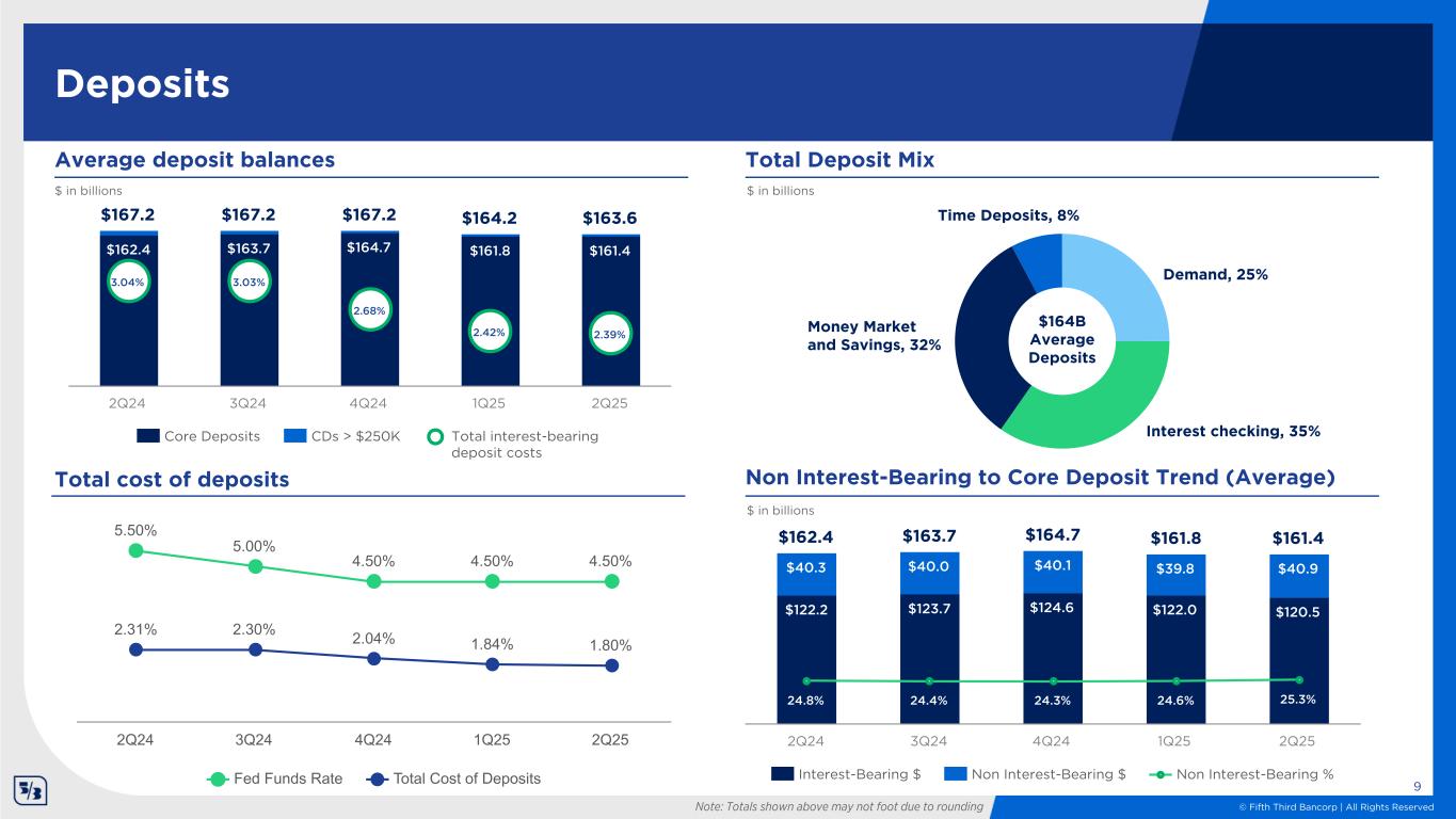© Fifth Third Bancorp | All Rights Reserved Solar energy installation Average loans $116.9 $116.8 $117.9 $121.3 $123.1 $72.2 $71.8 $72.0 $74.7 $75.4 $44.7 $45.1 $45.9 $46.6 $47.7 6.43% 6.48% 6.18% 6.06% 6.11% Commercial Consumer Total loan yield 2Q24 3Q24 4Q24 1Q25 2Q25 $116.6 $116.7 $119.8 $122.2 $122.4 $71.8 $71.1 $73.3 $75.1 $74.2 $44.8 $45.5 $46.5 $47.1 $48.2 Commercial Consumer 2Q24 3Q24 4Q24 1Q25 2Q25 Loans Loan portfolio compositionAverage loan & lease balances $ in billions; loan & lease balances excluding HFS Period-end loan & lease balances $ in billions; loan & lease balances excluding HFS 8 Note: totals shown above may not foot due to rounding 44% 15% 3% 14% 14% 4% 3% 3% Commercial and industrial Commercial real estate Commercial leases Residential mortgage Home equity Indirect secured consumer Credit card and other % of Total Loans Commercial: 61% Consumer: 39%
