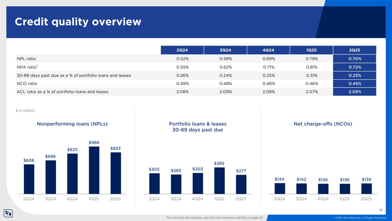 © Fifth Third Bancorp | All Rights Reserved 5.50% 5.00% 4.50% 4.50% 4.50% 2.31% 2.30% 2.04% 1.84% 1.80% Fed Funds Rate Total Cost of Deposits 2Q24 3Q24 4Q24 1Q25 2Q25 Total cost of deposits Total Deposit MixAverage deposit balances $167.2 $167.2 $167.2 $164.2 $163.6 $162.4 $163.7 $164.7 $161.8 $161.4 3.04% 3.03% 2.68% 2.42% 2.39% Core Deposits CDs > $250K Total interest-bearing deposit costs 2Q24 3Q24 4Q24 1Q25 2Q25 $ in billions Demand, 25% Interest checking, 35% Money Market and Savings, 32% Time Deposits, 8% $ in billions $164B Average Deposits $162.4 $163.7 $164.7 $161.8 $161.4 $122.2 $123.7 $124.6 $122.0 $120.5 $40.3 $40.0 $40.1 $39.8 $40.9 24.8% 24.4% 24.3% 24.6% 25.3% Interest-Bearing $ Non Interest-Bearing $ Non Interest-Bearing % 2Q24 3Q24 4Q24 1Q25 2Q25 Non Interest-Bearing to Core Deposit Trend (Average) $ in billions Deposits 9 Note: Totals shown above may not foot due to rounding