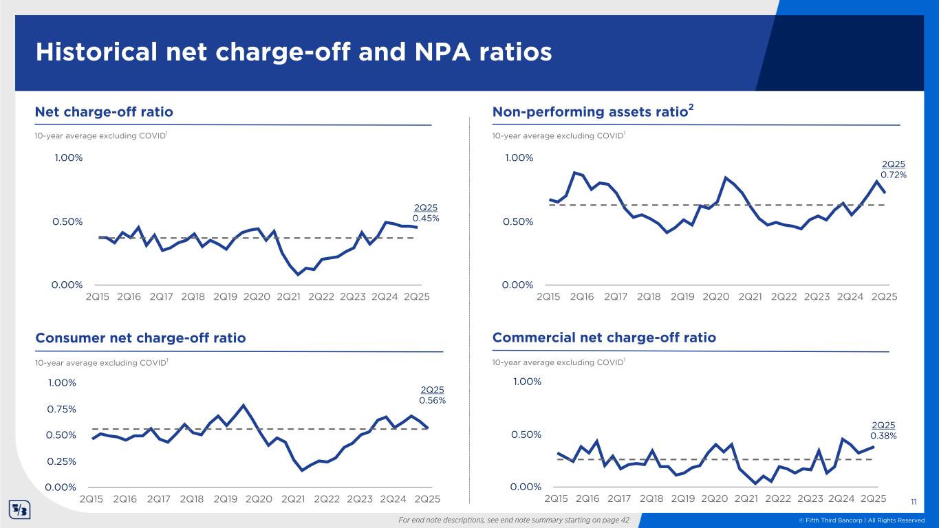 © Fifth Third Bancorp | All Rights Reserved Net charge-offs (NCOs) $144 $142 $136 $136 $139 2Q24 3Q24 4Q24 1Q25 2Q25 Credit quality overview 10 2Q24 3Q24 4Q24 1Q25 2Q25 NPL ratio 0.52% 0.59% 0.69% 0.79% 0.70% NPA ratio1 0.55% 0.62% 0.71% 0.81% 0.72% 30-89 days past due as a % of portfolio loans and leases 0.26% 0.24% 0.25% 0.31% 0.23% NCO ratio 0.49% 0.48% 0.46% 0.46% 0.45% ACL ratio as a % of portfolio loans and leases 2.08% 2.09% 2.08% 2.07% 2.09% Nonperforming loans (NPLs) $606 $686 $823 $966 $853 2Q24 3Q24 4Q24 1Q25 2Q25 Portfolio loans & leases 30-89 days past due $302 $283 $303 $385 $277 2Q24 3Q24 4Q24 1Q25 2Q25 $ in millions For end note descriptions, see end note summary starting on page 42