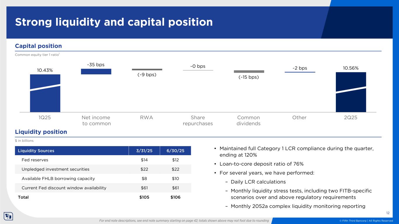 © Fifth Third Bancorp | All Rights Reserved 2Q15 2Q16 2Q17 2Q18 2Q19 2Q20 2Q21 2Q22 2Q23 2Q24 2Q25 0.00% 0.50% 1.00% Historical net charge-off and NPA ratios Net charge-off ratio Non-performing assets ratio2 2Q15 2Q16 2Q17 2Q18 2Q19 2Q20 2Q21 2Q22 2Q23 2Q24 2Q25 0.00% 0.50% 1.00% Commercial net charge-off ratio 2Q15 2Q16 2Q17 2Q18 2Q19 2Q20 2Q21 2Q22 2Q23 2Q24 2Q25 0.00% 0.50% 1.00% 2Q15 2Q16 2Q17 2Q18 2Q19 2Q20 2Q21 2Q22 2Q23 2Q24 2Q25 0.00% 0.25% 0.50% 0.75% 1.00% Consumer net charge-off ratio 2Q25 0.38% 2Q25 0.45% 2Q25 0.72% 2Q25 0.56% 10-year average excluding COVID1 10-year average excluding COVID1 10-year average excluding COVID1 10-year average excluding COVID1 For end note descriptions, see end note summary starting on page 42 11