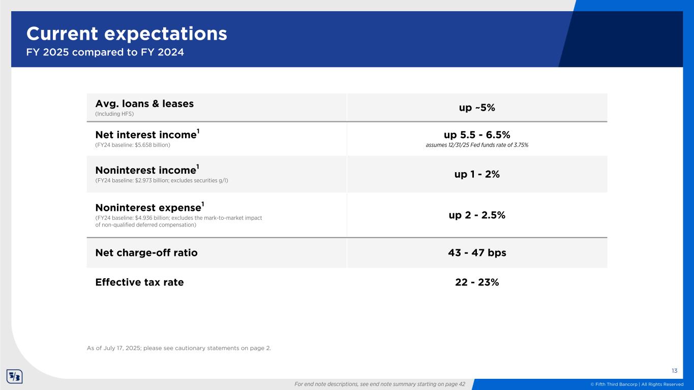 © Fifth Third Bancorp | All Rights Reserved 10.43% ~35 bps (~9 bps) ~0 bps (~15 bps) ~2 bps 10.56% 1Q25 Net income to common RWA Share repurchases Common dividends Other 2Q25 12 Strong liquidity and capital position Liquidity position $ in billions Capital position Common equity tier 1 ratio1 • Maintained full Category 1 LCR compliance during the quarter, ending at 120% • Loan-to-core deposit ratio of 76% • For several years, we have performed: – Daily LCR calculations – Monthly liquidity stress tests, including two FITB-specific scenarios over and above regulatory requirements – Monthly 2052a complex liquidity monitoring reporting For end note descriptions, see end note summary starting on page 42; totals shown above may not foot due to rounding Liquidity Sources 3/31/25 6/30/25 Fed reserves $14 $12 Unpledged investment securities $22 $22 Available FHLB borrowing capacity $8 $10 Current Fed discount window availability $61 $61 Total $105 $106