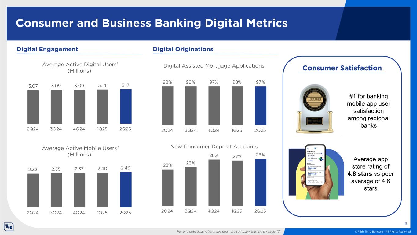 © Fifth Third Bancorp | All Rights Reserved Consumer and Business Banking Digital Metrics Average Active Digital Users (Millions) 3.07 3.09 3.09 3.14 3.17 2Q24 3Q24 4Q24 1Q25 2Q25 Digital Engagement Digital Originations Average Active Mobile Users (Millions) 2.32 2.35 2.37 2.40 2.43 2Q24 3Q24 4Q24 1Q25 2Q25 Digital Assisted Mortgage Applications 98% 98% 97% 98% 97% 2Q24 3Q24 4Q24 1Q25 2Q25 New Consumer Deposit Accounts 22% 23% 28% 27% 28% 2Q24 3Q24 4Q24 1Q25 2Q25 Consumer Satisfaction #1 for banking mobile app user satisfaction among regional banks Average app store rating of 4.8 stars vs peer average of 4.6 stars 16 For end note descriptions, see end note summary starting on page 42 1 2