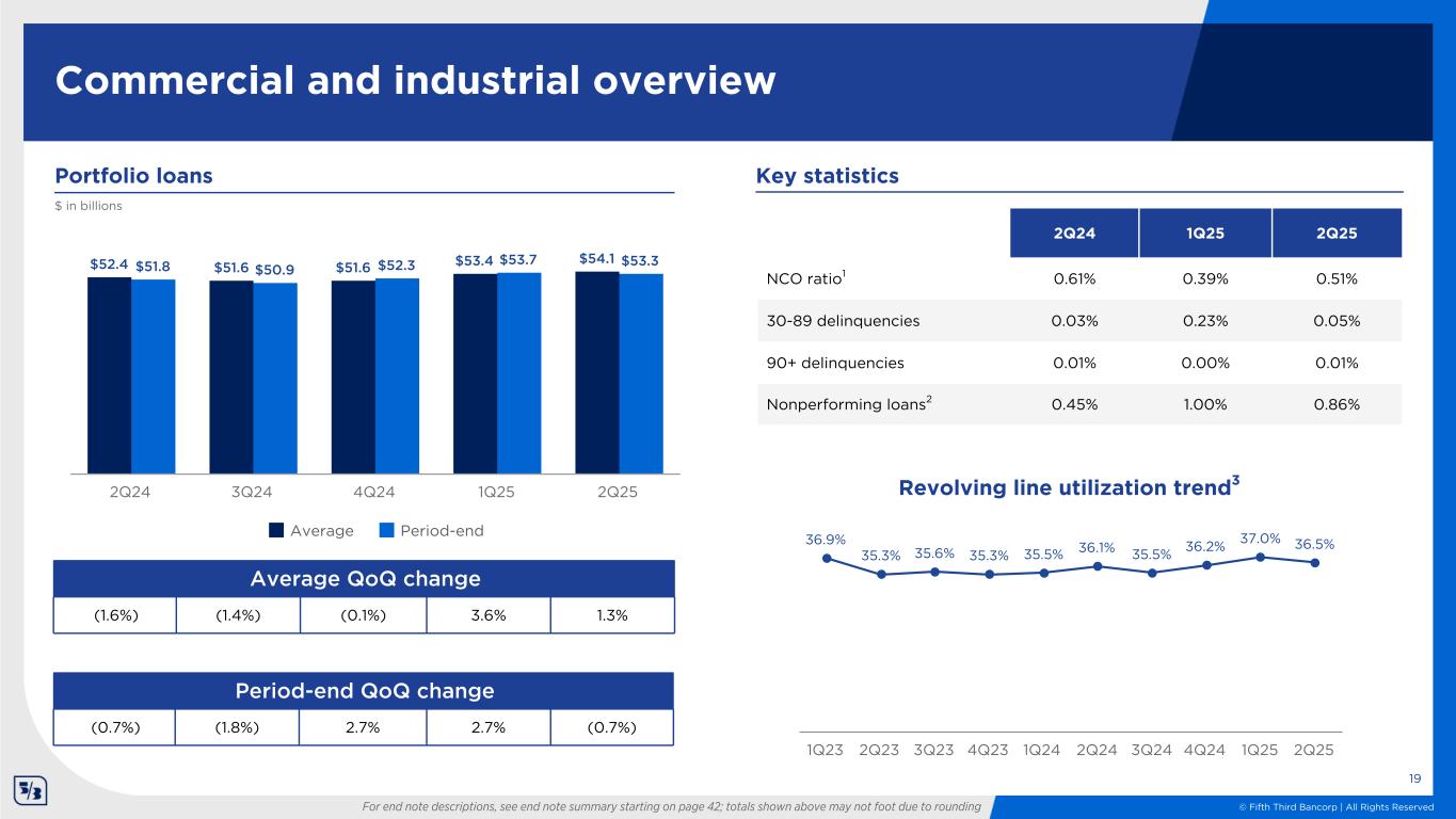 © Fifth Third Bancorp | All Rights Reserved $72.2 $71.8 $72.0 $74.7 $75.4 $71.8 $71.1 $73.3 $75.1 $74.2 Average Period-end 2Q24 3Q24 4Q24 1Q25 2Q25 2Q24 1Q25 2Q25 NCO ratio1 0.45% 0.35% 0.38% 30-89 delinquencies 0.09% 0.21% 0.06% 90+ delinquencies 0.01% 0.01% 0.01% Nonperforming loans2 0.38% 0.83% 0.69% Portfolio loans and leases $ in billions Key statistics Total commercial portfolio overview Average QoQ change (0.8%) (0.6%) 0.3% 3.8% 1.0% Period-end QoQ change (0.2%) (0.9%) 3.0% 2.5% (1.3%) Commercial portfolio mix 72% 16% 7% 4% C&I Commercial mortgage Commercial construction Commercial leases For end note descriptions, see end note summary starting on page 42; totals shown above may not foot due to rounding 18