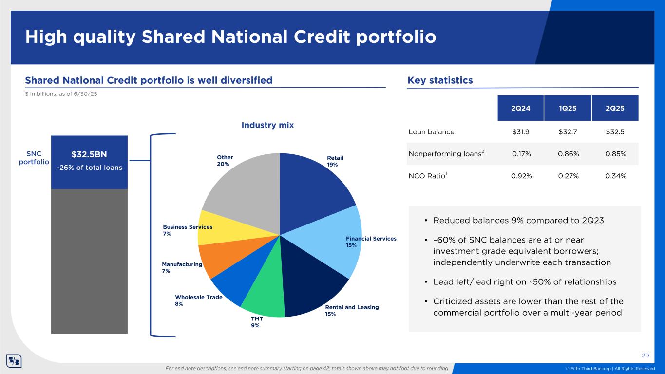 © Fifth Third Bancorp | All Rights Reserved $52.4 $51.6 $51.6 $53.4 $54.1$51.8 $50.9 $52.3 $53.7 $53.3 Average Period-end 2Q24 3Q24 4Q24 1Q25 2Q25 19 Key statistics Revolving line utilization trend3 Commercial and industrial overview 36.9% 35.3% 35.6% 35.3% 35.5% 36.1% 35.5% 36.2% 37.0% 36.5% 1Q23 2Q23 3Q23 4Q23 1Q24 2Q24 3Q24 4Q24 1Q25 2Q25 Portfolio loans $ in billions Average QoQ change (1.6%) (1.4%) (0.1%) 3.6% 1.3% Period-end QoQ change (0.7%) (1.8%) 2.7% 2.7% (0.7%) For end note descriptions, see end note summary starting on page 42; totals shown above may not foot due to rounding 2Q24 1Q25 2Q25 NCO ratio1 0.61% 0.39% 0.51% 30-89 delinquencies 0.03% 0.23% 0.05% 90+ delinquencies 0.01% 0.00% 0.01% Nonperforming loans2 0.45% 1.00% 0.86%