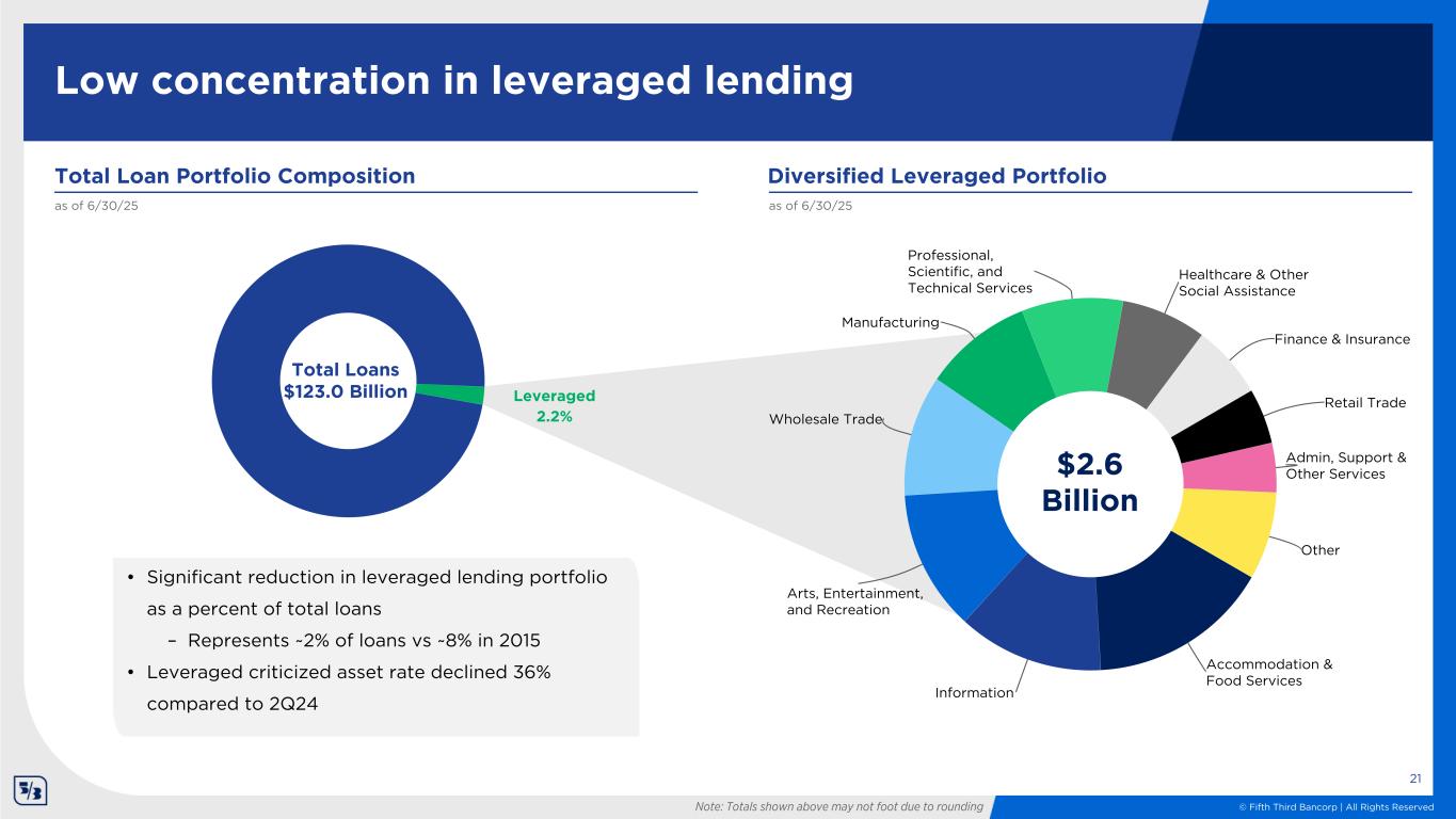 © Fifth Third Bancorp | All Rights Reserved • Reduced balances 9% compared to 2Q23 • ~60% of SNC balances are at or near investment grade equivalent borrowers; independently underwrite each transaction • Lead left/lead right on ~50% of relationships • Criticized assets are lower than the rest of the commercial portfolio over a multi-year period 20 High quality Shared National Credit portfolio $ in billions; as of 6/30/25 SNC portfolio $32.5BN ~26% of total loans Shared National Credit portfolio is well diversified Retail 19% Financial Services 15% Rental and Leasing 15% TMT 9% Wholesale Trade 8% Manufacturing 7% Business Services 7% Other 20% Industry mix Key statistics 2Q24 1Q25 2Q25 Loan balance $31.9 $32.7 $32.5 Nonperforming loans2 0.17% 0.86% 0.85% NCO Ratio1 0.92% 0.27% 0.34% For end note descriptions, see end note summary starting on page 42; totals shown above may not foot due to rounding