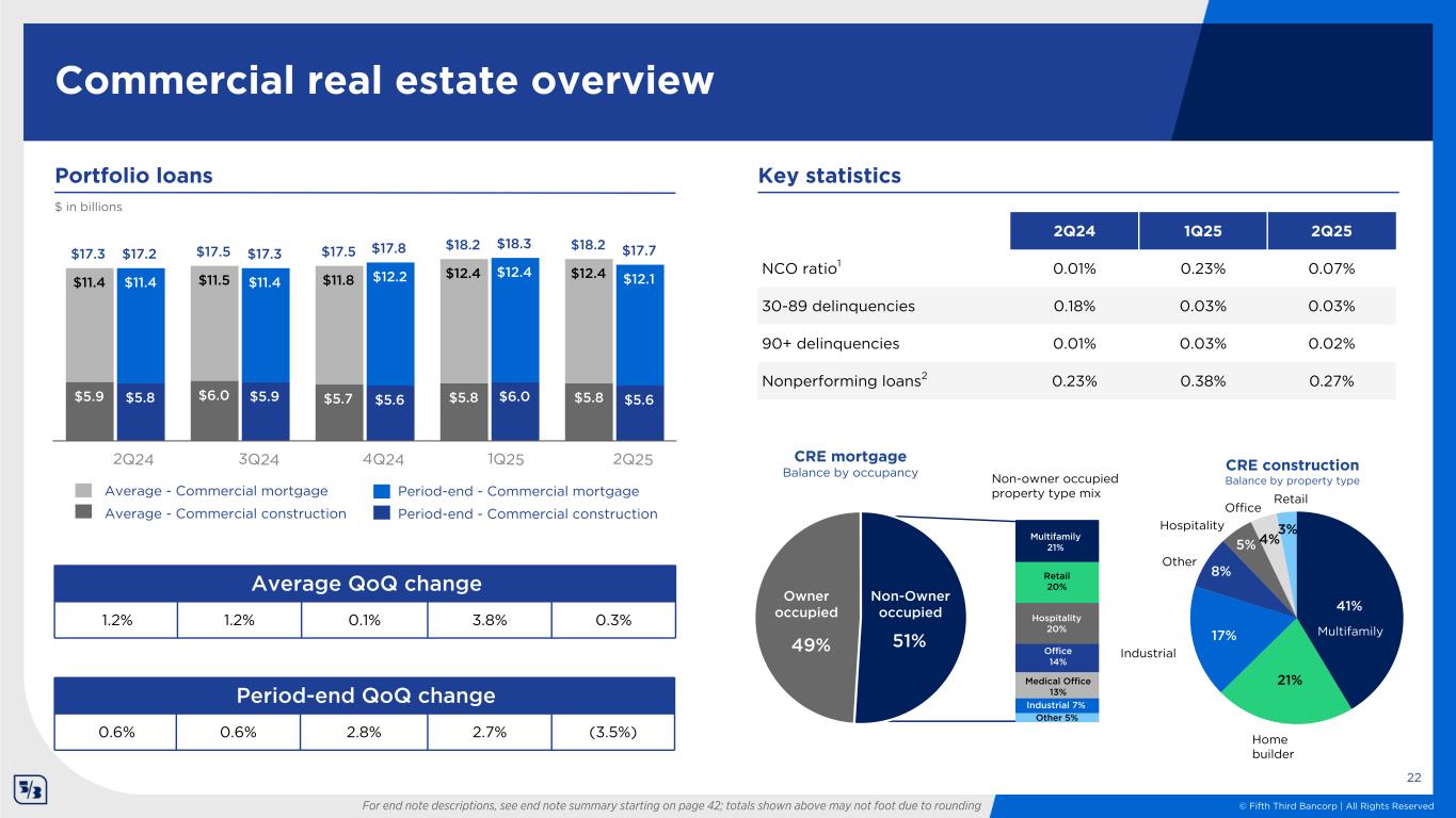 © Fifth Third Bancorp | All Rights Reserved 21 Low concentration in leveraged lending Note: Totals shown above may not foot due to rounding Total Loan Portfolio Composition Leveraged 2.2% Accommodation & Food Services Information Arts, Entertainment, and Recreation Wholesale Trade Manufacturing Professional, Scientific, and Technical Services Healthcare & Other Social Assistance Finance & Insurance Retail Trade Admin, Support & Other Services Other Diversified Leveraged Portfolio Total Loans $123.0 Billion $2.6 Billion • Significant reduction in leveraged lending portfolio as a percent of total loans – Represents ~2% of loans vs ~8% in 2015 • Leveraged criticized asset rate declined 36% compared to 2Q24 as of 6/30/25 as of 6/30/25