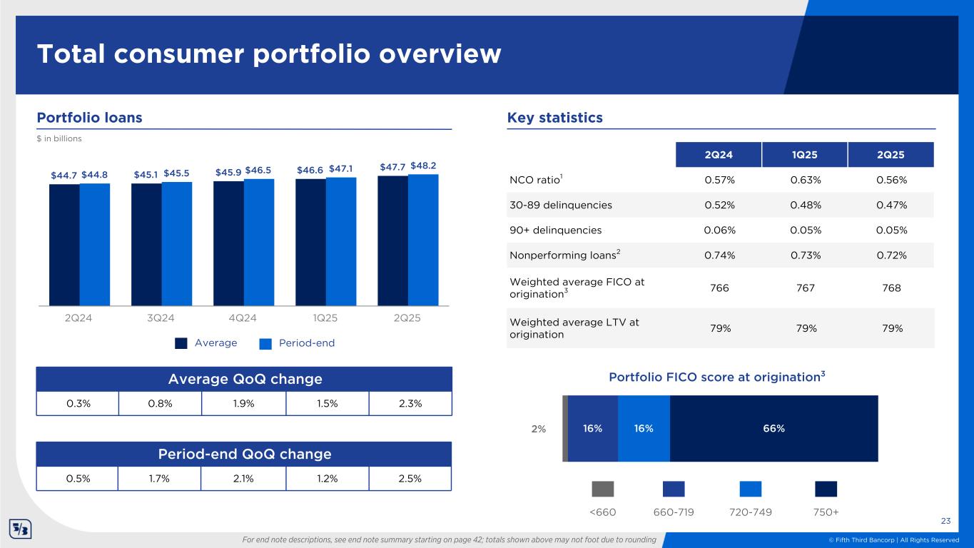 © Fifth Third Bancorp | All Rights Reserved Portfolio loans 41% 21% 17% 8% 5% 4% 3% 51%49% Commercial real estate overview CRE mortgage Balance by occupancy CRE construction Balance by property type Multifamily Other Retail Office Hospitality Industrial Home builder Non-Owner occupied Owner occupied Multifamily 21% Retail 20% Hospitality 20% Office 14% Medical Office 13% Industrial 7% Non-owner occupied property type mix $17.3 $17.5 $17.5 $18.2 $18.2 $17.2 $17.3 $17.8 $18.3 $17.7 $5.9 $6.0 $5.7 $5.8 $5.8 $11.4 $11.5 $11.8 $12.4 $12.4 $5.8 $5.9 $5.6 $6.0 $5.6 $11.4 $11.4 $12.2 $12.4 $12.1 2Q24 3Q24 4Q24 1Q25 2Q25 22 Other 5% For end note descriptions, see end note summary starting on page 42; totals shown above may not foot due to rounding Period-end QoQ change 0.6% 0.6% 2.8% 2.7% (3.5%) $ in billions Average QoQ change 1.2% 1.2% 0.1% 3.8% 0.3% 2Q24 1Q25 2Q25 NCO ratio1 0.01% 0.23% 0.07% 30-89 delinquencies 0.18% 0.03% 0.03% 90+ delinquencies 0.01% 0.03% 0.02% Nonperforming loans2 0.23% 0.38% 0.27% Key statistics Period-end - Commercial mortgageAverage - Commercial mortgage Period-end - Commercial constructionAverage - Commercial construction