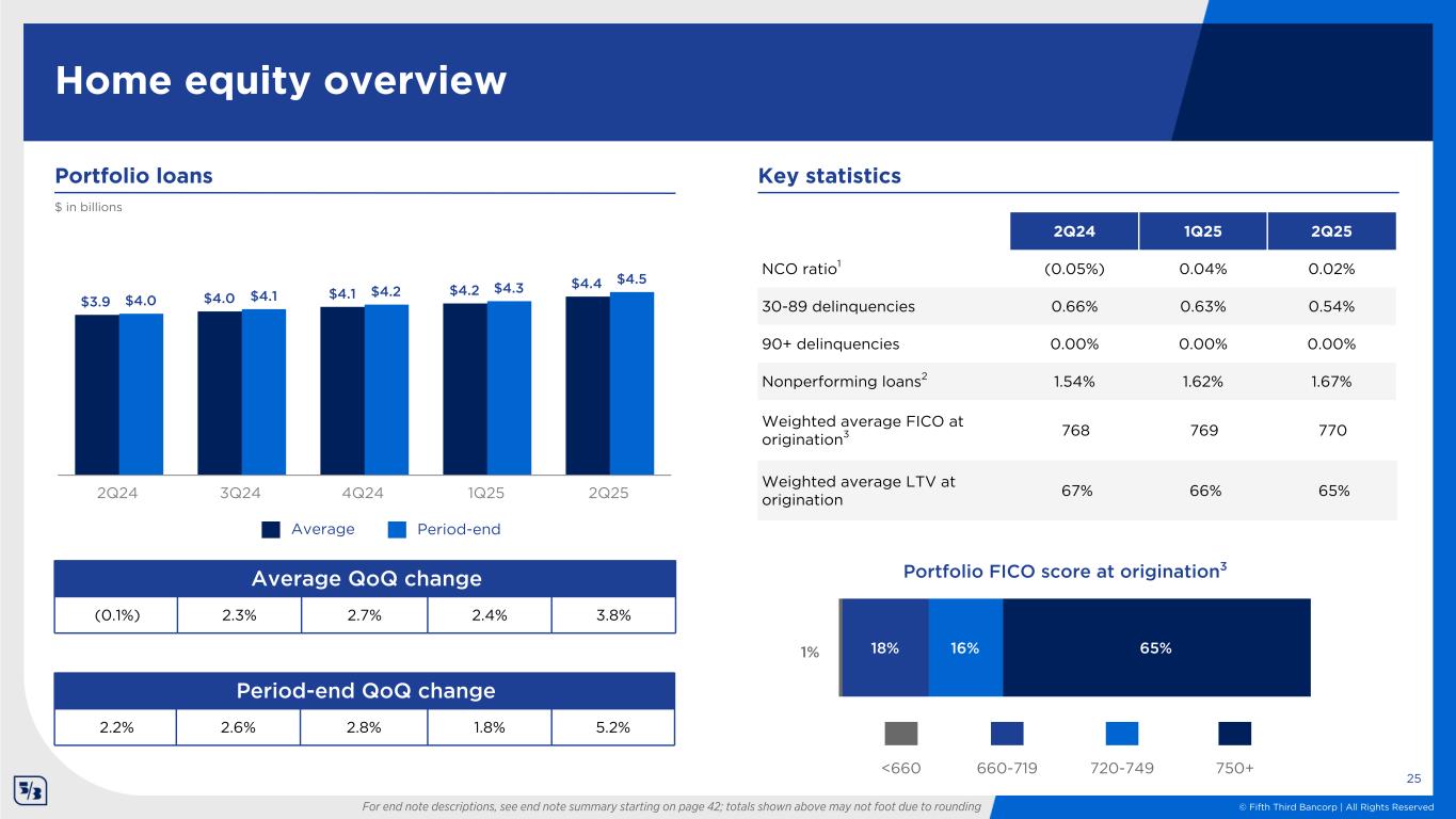 © Fifth Third Bancorp | All Rights Reserved Period-end QoQ change 0.3% 0.7% 2.2% 0.2% 0.6% Average QoQ change 0.2% 0.2% 1.7% 1.3% 0.4% 12% 15% 69% Weighted average FICO at origination3 764 764 764 Weighted average LTV at origination 73% 74% 74% Residential mortgage overview 24 $17.0 $17.0 $17.3 $17.6 $17.6$17.0 $17.2 $17.5 $17.6 $17.7 2Q24 3Q24 4Q24 1Q25 2Q25 3% For end note descriptions, see end note summary starting on page 42; totals shown above may not foot due to rounding $ in billions Portfolio loans 2Q24 1Q25 2Q25 NCO ratio1 (0.01%) 0.00% (0.01%) 30-89 delinquencies 0.15% 0.15% 0.17% 90+ delinquencies 0.05% 0.05% 0.05% Nonperforming Loans2 0.76% 0.82% 0.81% Key statistics 750+720-749<660 660-719 Portfolio FICO score at origination3 Period-endAverage