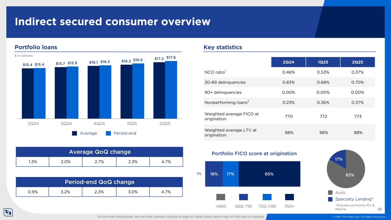 © Fifth Third Bancorp | All Rights Reserved 18% 16% 65% $3.9 $4.0 $4.1 $4.2 $4.4 $4.0 $4.1 $4.2 $4.3 $4.5 2Q24 3Q24 4Q24 1Q25 2Q25 Weighted average FICO at origination3 768 769 770 Weighted average LTV at origination 67% 66% 65% Home equity overview 25 1% For end note descriptions, see end note summary starting on page 42; totals shown above may not foot due to rounding Period-end QoQ change 2.2% 2.6% 2.8% 1.8% 5.2% Average QoQ change (0.1%) 2.3% 2.7% 2.4% 3.8% $ in billions Portfolio loans Period-endAverage 750+720-749<660 660-719 Portfolio FICO score at origination3 2Q24 1Q25 2Q25 NCO ratio1 (0.05%) 0.04% 0.02% 30-89 delinquencies 0.66% 0.63% 0.54% 90+ delinquencies 0.00% 0.00% 0.00% Nonperforming loans2 1.54% 1.62% 1.67% Key statistics