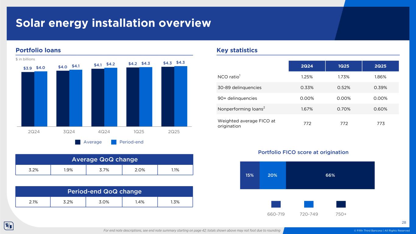 © Fifth Third Bancorp | All Rights Reserved 27% 20% 49% Credit card overview 27 $1.7 $1.7 $1.7 $1.6 $1.7 $1.7 $1.7 $1.7 $1.7 $1.7 2Q24 3Q24 4Q24 1Q25 2Q25 Weighted average FICO at origination3 743 743 743 5% Period-end QoQ change (0.2%) (1.7%) 1.8% (4.3%) 2.8% Average QoQ change (2.5%) (1.2%) (2.3%) (2.5%) 2.0% $ in billions Portfolio loans For end note descriptions, see end note summary starting on page 42; totals shown above may not foot due to rounding Period-endAverage 2Q24 1Q25 2Q25 NCO ratio1 3.98% 4.19% 3.74% 30-89 delinquencies 1.10% 1.02% 1.00% 90+ delinquencies 0.98% 1.02% 1.05% Nonperforming loans2 1.79% 1.87% 1.70% Key statistics Portfolio FICO score at origination3 750+720-749<660 660-719