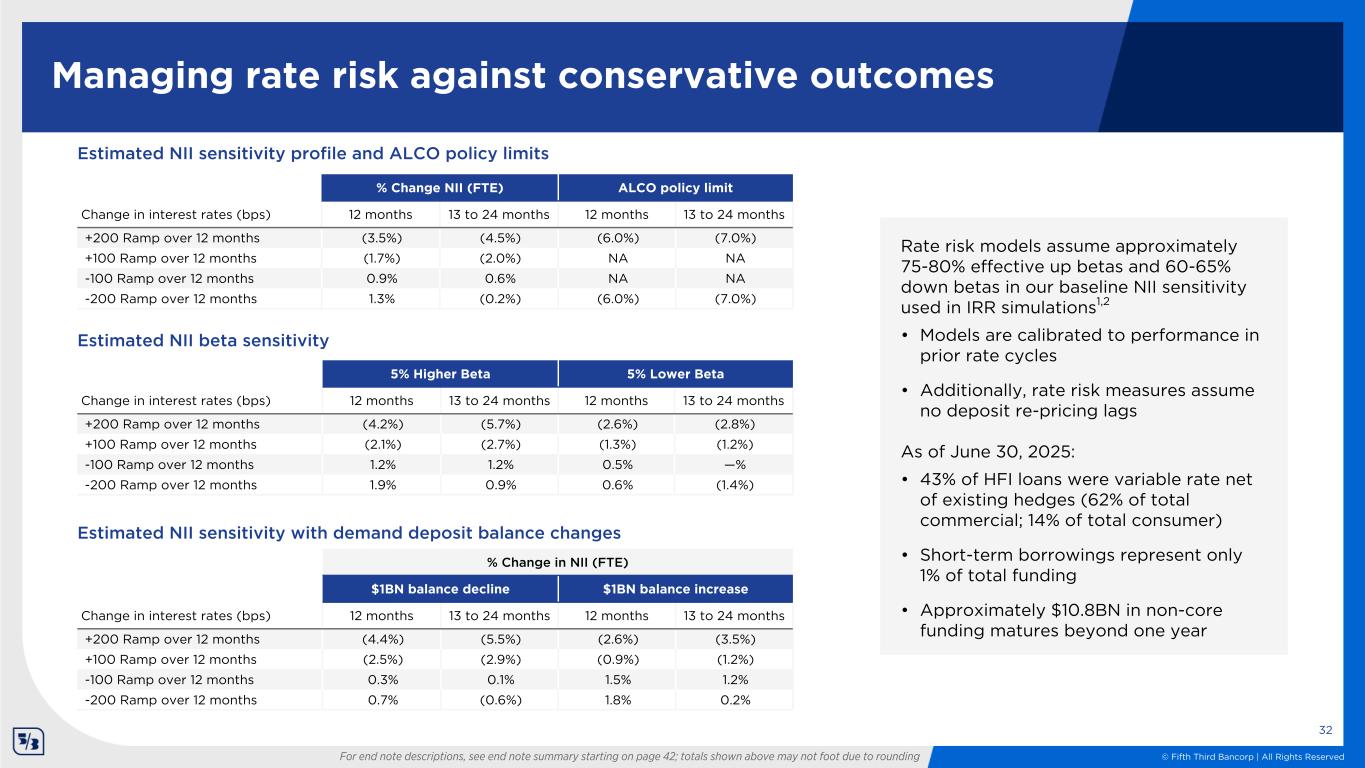 © Fifth Third Bancorp | All Rights Reserved Balance sheet positioning 31 For end note descriptions, see end note summary starting on page 42; totals shown above may not foot due to rounding C&I 35% Fix | 65% Variable Coml. mortgage 40% Fix | 60% Variable Coml. construction 30% Fix | 70% Variable Coml. lease 100% Fix | 0% Variable 32% 54% 14% 72% 16% 8% 4% • 54% allocation to bullet/locked- out cash flow securities • AFS & HTM spot yield: 3.19% • AFS net unrealized pre-tax loss: $3.5BN $28.5BN fixed | $45.7BN variable1,2 Commercial loans1,2 Investment portfolioConsumer loans1 Long-term debt3 $41.5BN fixed | $6.7BN variable1 $9.3BN fixed | $5.2BN variable3 • 1M based: 37%4,7 • 3M based: 7%4,7 • Prime & O/N based: 17%4,7 • Other based: 1%4,6,7 • Weighted avg. life: 1.7 years1 • 1M based: 1%5,7 • Prime: 12%5 • Other based: 1%5,7,8 • Weighted avg. life: 3.8 years1 • SOFR based: 36% • Weighted avg. life: 4.4 years Includes $3.6BN non-agency CMBS (All super-senior, AAA-rated securities; 58.5% WA LTV, ~35% WA credit enhancement) 36% 37% 9% 14% 4% 70% 12% 5% 13% The information above incorporates the impact of $11BN in C&I receive-fixed swaps, $4BN in CRE receive-fixed swaps2, and ~$5BN fair value hedges associated with long-term debt (receive-fixed swaps) Auto/indirect 100% Fix | 0% Variable Resi mtg. & construction 96% Fix | 4% Variable Home equity 12% Fix | 88% Variable Other 84% Fix | 16% Variable Credit card 38% Fix | 62% Variable Level 1 80% Fix | 20% Variable Level 2A 100% Fix | 0% Variable Non-HQLA/ Other 91% Fix | 9% Variable Senior debt 57% Fix | 43% Variable Sub debt 59% Fix | 41% Variable Auto securiz. proceeds 100% Fix | 0% Variable Other 97% Fix | 3% Variable