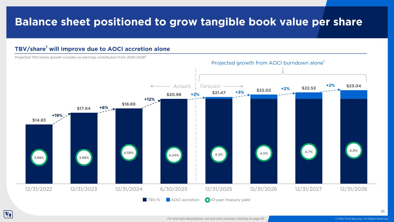 © Fifth Third Bancorp | All Rights Reserved 10-year treasury yield ($5.8) ($4.2) ($3.2) ($4.0) ($3.5) ($3.3) 9/30/23 6/30/24 9/30/24 12/31/24 3/31/25 6/30/25 Projected AOCI accretion ($2.9) ($2.6) ($2.2) ($1.9) ($1.6) 12/31/25E 12/31/26E 12/31/27E 12/31/28E 12/31/29E Securities portfolio AOCI accretion 34 $ in billions; 6/30/25 AFS and HTM portfolio unrealized loss, after-tax ~42% capital accretion ~21% capital accretion Historical AOCI accretion ~44% capital accretion since 3Q23 AOCI accretion1 assuming implied forward curve2 4.2%4.4% 3.8% 4.6% 4.2% For end note descriptions, see end note summary starting on page 42; totals shown above may not foot due to rounding 4.6%