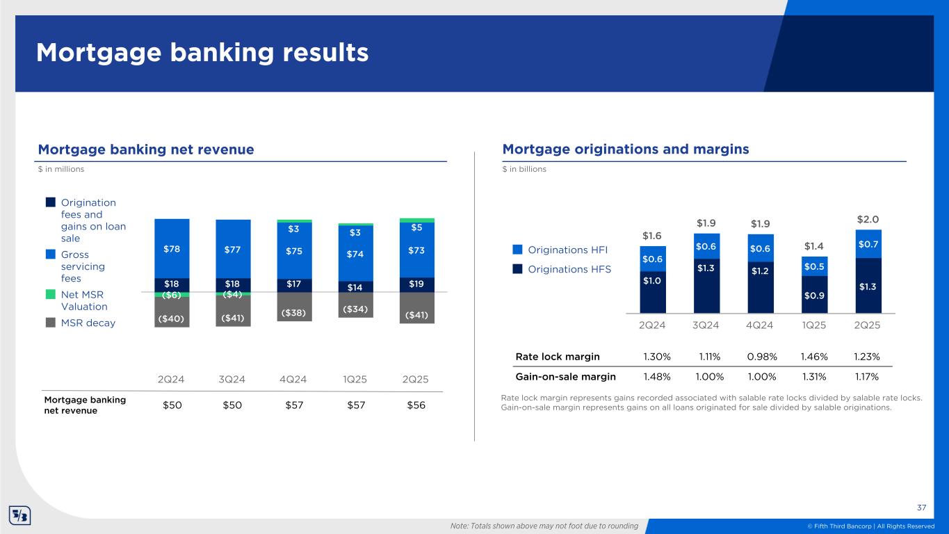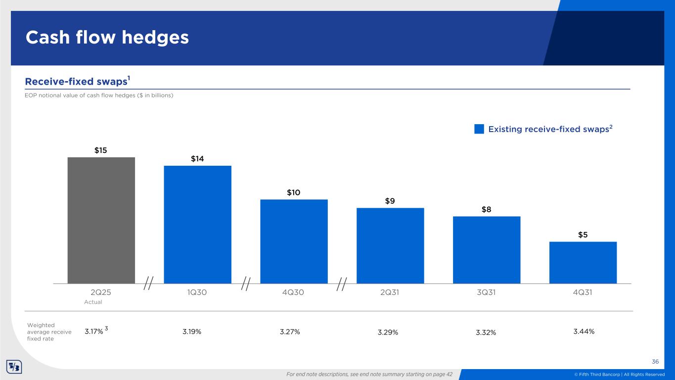 © Fifth Third Bancorp | All Rights Reserved 3.17% $15 $14 $10 $9 $8 $5 2Q25 1Q30 4Q30 2Q31 3Q31 4Q31 Cash flow hedges Receive-fixed swaps1 EOP notional value of cash flow hedges ($ in billions) Actual 36 Existing receive-fixed swaps2 Weighted average receive fixed rate 3.27%3.19% 3.29% 3.32% 3.44%3 For end note descriptions, see end note summary starting on page 42
