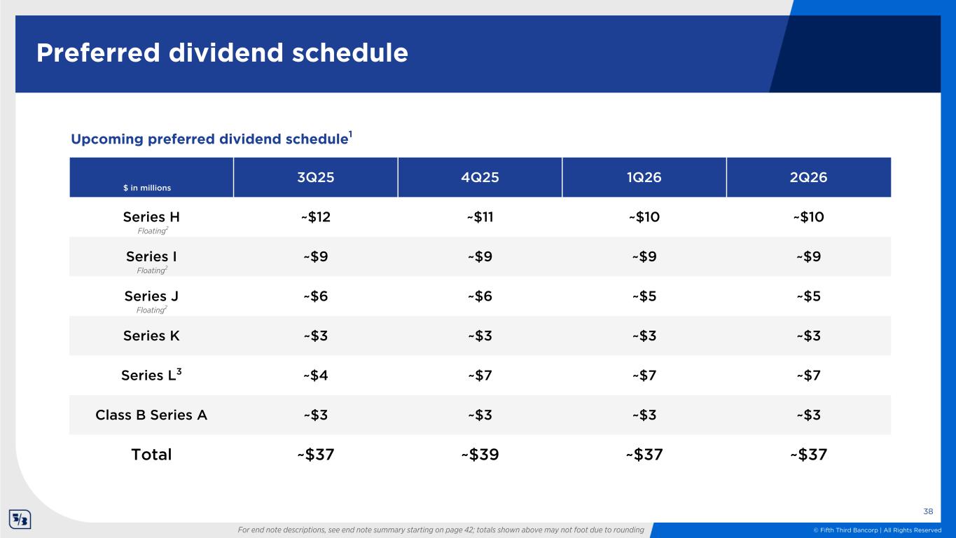 © Fifth Third Bancorp | All Rights Reserved Preferred dividend schedule 3Q25 4Q25 1Q26 2Q26 Series H ~$12 ~$11 ~$10 ~$10 Series I ~$9 ~$9 ~$9 ~$9 Series J ~$6 ~$6 ~$5 ~$5 Series K ~$3 ~$3 ~$3 ~$3 Series L3 ~$4 ~$7 ~$7 ~$7 Class B Series A ~$3 ~$3 ~$3 ~$3 Total ~$37 ~$39 ~$37 ~$37 Upcoming preferred dividend schedule1 $ in millions 38 Floating2 Floating2 Floating2 For end note descriptions, see end note summary starting on page 42; totals shown above may not foot due to rounding