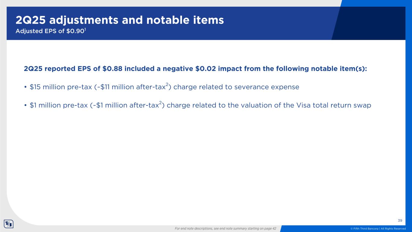 © Fifth Third Bancorp | All Rights Reserved 2Q25 reported EPS of $0.88 included a negative $0.02 impact from the following notable item(s): • $15 million pre-tax (~$11 million after-tax2) charge related to severance expense • $1 million pre-tax (~$1 million after-tax2) charge related to the valuation of the Visa total return swap 2Q25 adjustments and notable items Adjusted EPS of $0.901 39 For end note descriptions, see end note summary starting on page 42