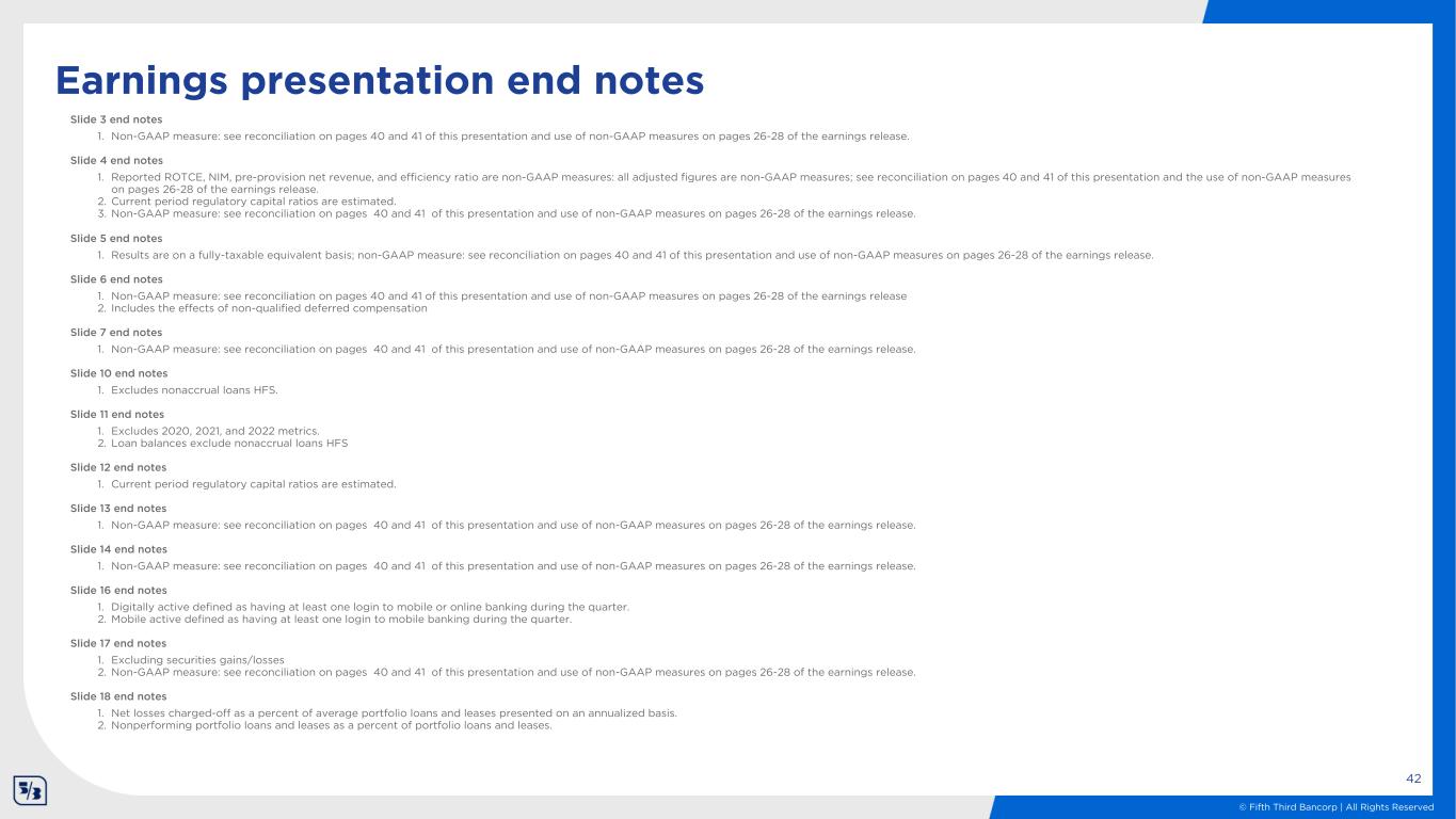 © Fifth Third Bancorp | All Rights Reserved Non-GAAP reconciliation 41 Fifth Third Bancorp and Subsidiaries For three months ended $ and shares in millions (unaudited) June March December September June 2025 2025 2024 2024 2024 Average interest-earning assets (a) $192,682 $192,808 $193,513 $195,836 $194,499 Net interest income (U.S. GAAP) (b) $1,495 $1,437 $1,437 $1,421 $1,387 Add: Taxable equivalent adjustment 5 5 6 6 6 Net interest income (FTE) (c) $1,500 $1,442 $1,443 $1,427 $1,393 Legal settlements and remediations — — — — 5 Adjusted net interest income (FTE) (d) $1,500 $1,442 $1,443 $1,427 $1,398 Net interest income (FTE) (annualized) (e) $6,016 $5,848 $5,741 $5,677 $5,603 Adjusted net interest income (FTE) (annualized) (f) $6,016 $5,848 $5,741 $5,677 $5,623 Noninterest income (U.S. GAAP) (g) $750 $694 $732 $711 $695 Valuation of Visa total return swap 1 18 51 47 23 Legal settlements and remediations — — — — 2 Adjusted noninterest income (h) $751 $712 $783 $758 $720 Add: Securities (gains)/losses (16) 9 8 (10) (3) Adjusted noninterest income, (excl. securities (gains)/losses) $735 $721 $791 $748 $717 Noninterest expense (U.S. GAAP) (i) $1,264 $1,304 $1,226 $1,244 $1,221 Interchange litigation matters — — (4) (10) — Severance expense (15) — — (9) — Legal settlements and remediations — — — — (11) FDIC Special Assessment — — 11 — (6) Fifth Third Foundation contribution — — (15) — — Adjusted noninterest expense (j) $1,249 $1,304 $1,218 $1,225 $1,204 Metrics: Revenue (FTE) (c) + (g) 2,250 2,136 2,175 2,138 2,088 Adjusted revenue (d) + (h) 2,251 2,154 2,226 2,185 2,118 Pre-provision net revenue [(c) + (g) - (i)] 986 832 949 894 867 Adjusted pre-provision net revenue [(d) + (h) - (j)] 1,002 850 1,008 960 914 Net interest margin (FTE) (e) / (a) 3.12% 3.03% 2.97% 2.90% 2.88% Adjusted net interest margin (FTE) (f) / (a) 3.12% 3.03% 2.97% 2.90% 2.89% Efficiency ratio (FTE) (i) / [(c) + (g)] 56.2% 61.0% 56.4% 58.2% 58.5% Adjusted efficiency ratio (j) / [(d) + (h)] 55.5% 60.5% 54.7% 56.1% 56.8% For end note descriptions, see end note summary starting on page 42; totals shown above may not foot due to rounding