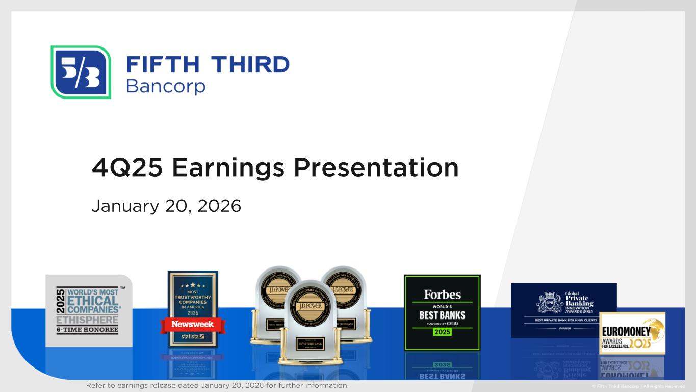 © Fifth Third Bancorp | All Rights Reserved 44 Earnings presentation end notes Slide 30 end notes 1. Loan balances exclude nonaccrual loans HFS. Slide 31 end notes Note: Data as of 12/31/2025. 1. Excludes HFS Loans & Leases. 2. Fifth Third had $10.85BN of commercial variable loans classified as fixed given the impacts of $6.85BN in C&I receive-fix swaps and $4BN in CRE receive-fix swaps 3. Fifth Third had $4.21BN SOFR receive-fix swaps outstanding against long-term debt, which are being included in floating long-term debt. 4. As a percent of total commercial. 5. As a percent of total consumer. 6. Includes 12M term, 6M term, and Fed Funds based loans. 7. Term points include SOFR, AMERIBOR, Treasuries & FX curves. 8. Includes overnight term, 3M term, 6M term, 12M term and Fed Funds. Slide 32 end notes Note: Data as of 12/31/25; actual results may vary from these simulated results due to differences between forecasted and actual balance sheet composition, timing, magnitude, and frequency of interest rate changes, as well as other changes in market conditions and management strategies. 1. Re-pricing percentage or “beta” is the estimated change in yield after the 12-month ramp scenarios are fully realized and therefore reflects year-2. 2. Betas are asymmetrical as down betas assume a floor of 0%, along with rate floors, and up betas assumes a cap of 100% Slide 34 end notes 1. See forward-looking statements on page 2 of this presentation regarding forward-looking non-GAAP measures and use of non-GAAP measures on pages 27-29 of the earnings release. 2. Analysis based on Fifth Third standalone 12/31/2025 portfolio utilizing the implied forward curve as of 12/31/2025 Slide 35 end notes 1. See forward-looking statements on page 2 of this presentation regarding forward-looking non-GAAP measures and use of non-GAAP measures on pages 27-29 of the earnings release. 2. Analysis based on Fifth Third standalone 12/31/2025 portfolio utilizing the implied forward curve as of 12/31/2025 Slide 36 end notes 1. Represents forward looking statement, please refer to page 2 of this presentation regarding forward-looking non-GAAP measures 2. Existing swaps transition from receive fixed / pay 1-month LIBOR to receive fixed / pay compound SOFR + 11.448 bps on their next post-LIBOR cessation resets 3. Reflects the weighted average receive fixed rate (swaps only) as of 12/31/25 Slide 38 end notes 1. Represents forward looking statement, please refer to page 2 of this presentation regarding forward-looking non-GAAP measures. 2. Projected dividends for the Series J, Series H, and Series I reflect 3m Term SOFR plus the applicable spread. For the periods referencing 3m Term SOFR, the projections include the 26.161bps spread adjustment pursuant to the final rule adopted by the Federal Reserve. 3. Series M Preferred Stock to be issued in exchange for Comerica Incorporated's 6.875 Fixed-Rate Reset Non-Cumulative Perpetual Preferred Stock, Series B as part of the anticipated closing of Comerica's merger with and into Fifth Third. The initial dividend period will be January 1, 2026 - April 1, 2026. The initial dividend payment date will be April 1, 2026. Slide 39 end notes 1. Average diluted common shares outstanding (thousands); 669,153; all adjusted figures are non-GAAP measures; see reconciliation on pages 40 and 41 of this presentation and the use of non-GAAP measures on pages 27-29 of the earnings release. 2. Assumes a 24% tax rate. 3. A portion of the adjustments related to merger-related expenses are not tax-deductible Slide 40 end notes Note: See pages 27-29 of the earnings release for a discussion on the use of non-GAAP financial measures. 1. Assumes a 23% tax rate in 2024 and a 24% tax rate in 2025. Slide 41 end notes Note: See pages 27-29 of the earnings release for a discussion on the use of non-GAAP financial measures.