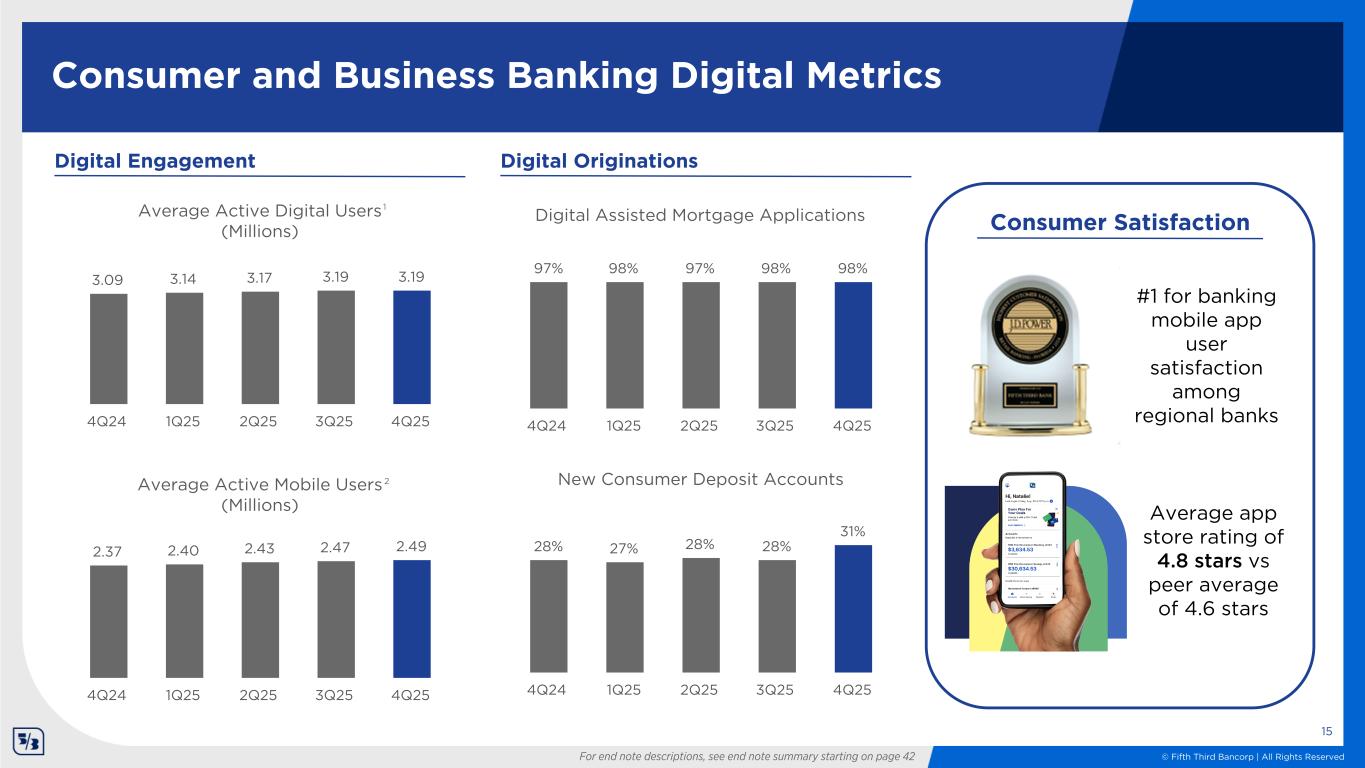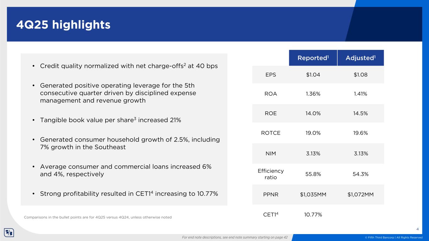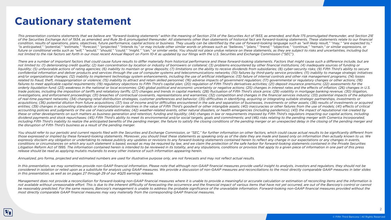 © Fifth Third Bancorp | All Rights Reserved This presentation contains statements that we believe are “forward-looking statements” within the meaning of Section 27A of the Securities Act of 1933, as amended, and Rule 175 promulgated thereunder, and Section 21E of the Securities Exchange Act of 1934, as amended, and Rule 3b-6 promulgated thereunder. All statements other than statements of historical fact are forward-looking statements. These statements relate to our financial condition, results of operations, plans, objectives, future performance, capital actions or business. They usually can be identified by the use of forward-looking language such as “will likely result,” “may,” “are expected to,” “is anticipated,” “potential,” “estimate,” “forecast,” “projected,” “intends to,” or may include other similar words or phrases such as “believes,” “plans,” “trend,” “objective,” “continue,” “remain,” or similar expressions, or future or conditional verbs such as “will,” “would,” “should,” “could,” “might,” “can,” or similar verbs. You should not place undue reliance on these statements, as they are subject to risks and uncertainties, including but not limited to the risk factors set forth in our most recent Annual Report on Form 10-K as updated by our filings with the U.S. Securities and Exchange Commission (“SEC”). There are a number of important factors that could cause future results to differ materially from historical performance and these forward-looking statements. Factors that might cause such a difference include, but are not limited to: (1) deteriorating credit quality; (2) loan concentration by location or industry of borrowers or collateral; (3) problems encountered by other financial institutions; (4) inadequate sources of funding or liquidity; (5) unfavorable actions of rating agencies; (6) inability to maintain or grow deposits; (7) limitations on the ability to receive dividends from subsidiaries; (8) cyber-security risks; (9) Fifth Third’s ability to secure confidential information and deliver products and services through the use of computer systems and telecommunications networks; (10) failures by third-party service providers; (11) inability to manage strategic initiatives and/or organizational changes; (12) inability to implement technology system enhancements, including the use of artificial intelligence; (13) failure of internal controls and other risk management programs; (14) losses related to fraud, theft, misappropriation or violence; (15) inability to attract and retain skilled personnel; (16) adverse impacts of government regulation; (17) governmental or regulatory changes or other actions; (18) failures to meet applicable capital requirements; (19) regulatory objections to Fifth Third’s capital plan; (20) regulation of Fifth Third’s derivatives activities; (21) deposit insurance premiums; (22) assessments for the orderly liquidation fund; (23) weakness in the national or local economies; (24) global political and economic uncertainty or negative actions; (25) changes in interest rates and the effects of inflation; (26) changes in U.S. trade policies, including the imposition of tariffs and retaliatory tariffs; (27) changes and trends in capital markets; (28) fluctuation of Fifth Third’s stock price; (29) volatility in mortgage banking revenue; (30) litigation, investigations, and enforcement proceedings; (31) breaches of contractual covenants, representations and warranties; (32) competition and changes in the financial services industry; (33) potential impacts of the adoption of real-time payment networks; (34) changing retail distribution strategies, customer preferences and behavior; (35) difficulties in identifying, acquiring or integrating suitable strategic partnerships, investments or acquisitions; (36) potential dilution from future acquisitions; (37) loss of income and/or difficulties encountered in the sale and separation of businesses, investments or other assets; (38) results of investments or acquired entities; (39) changes in accounting standards or interpretation or declines in the value of Fifth Third’s goodwill or other intangible assets; (40) inaccuracies or other failures from the use of models; (41) effects of critical accounting policies and judgments or the use of inaccurate estimates; (42) weather-related events, other natural disasters, or health emergencies (including pandemics); (43) the impact of reputational risk created by these or other developments on such matters as business generation and retention, funding and liquidity; (44) changes in law or requirements imposed by Fifth Third’s regulators impacting our capital actions, including dividend payments and stock repurchases; (45) Fifth Third's ability to meet its environmental and/or social targets, goals and commitments; and (46) risks relating to the pending merger with Comerica Incorporated, including Fifth Third’s inability to realize the anticipated benefits of the pending merger, the failure to satisfy the closing conditions of the pending merger or an unexpected delay in the closing of the pending merger and the disruption of Fifth Third’s business as a result of the pending merger. You should refer to our periodic and current reports filed with the Securities and Exchange Commission, or “SEC,” for further information on other factors, which could cause actual results to be significantly different from those expressed or implied by these forward-looking statements. Moreover, you should treat these statements as speaking only as of the date they are made and based only on information then actually known to us. We expressly disclaim any obligation or undertaking to release publicly any updates or revisions to any forward-looking statements contained herein to reflect any change in our expectations or any changes in events, conditions or circumstances on which any suc