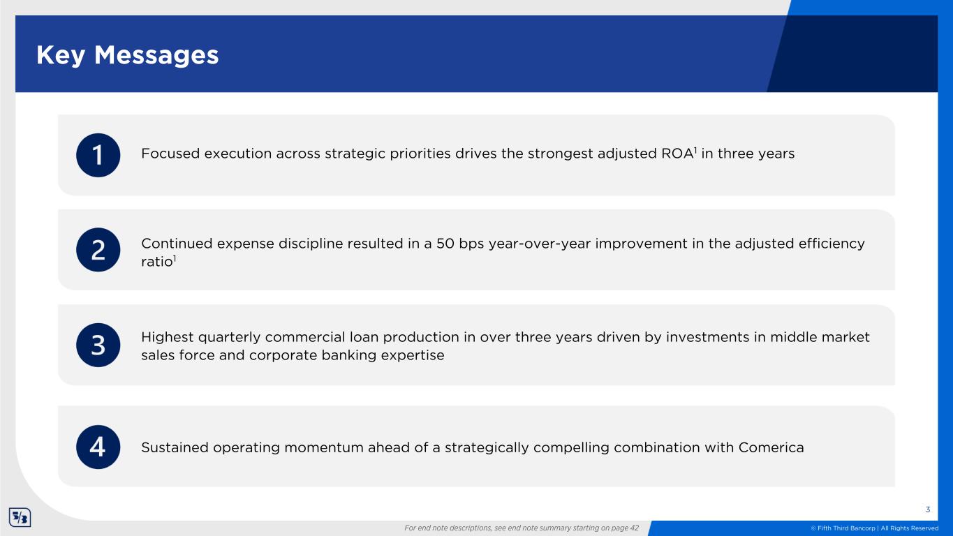 © Fifth Third Bancorp | All Rights Reserved For end note descriptions, see end note summary starting on page 42 Key Messages 3 Sustained operating momentum ahead of a strategically compelling combination with Comerica Focused execution across strategic priorities drives the strongest adjusted ROA1 in three years Continued expense discipline resulted in a 50 bps year-over-year improvement in the adjusted efficiency ratio1 Highest quarterly commercial loan production in over three years driven by investments in middle market sales force and corporate banking expertise