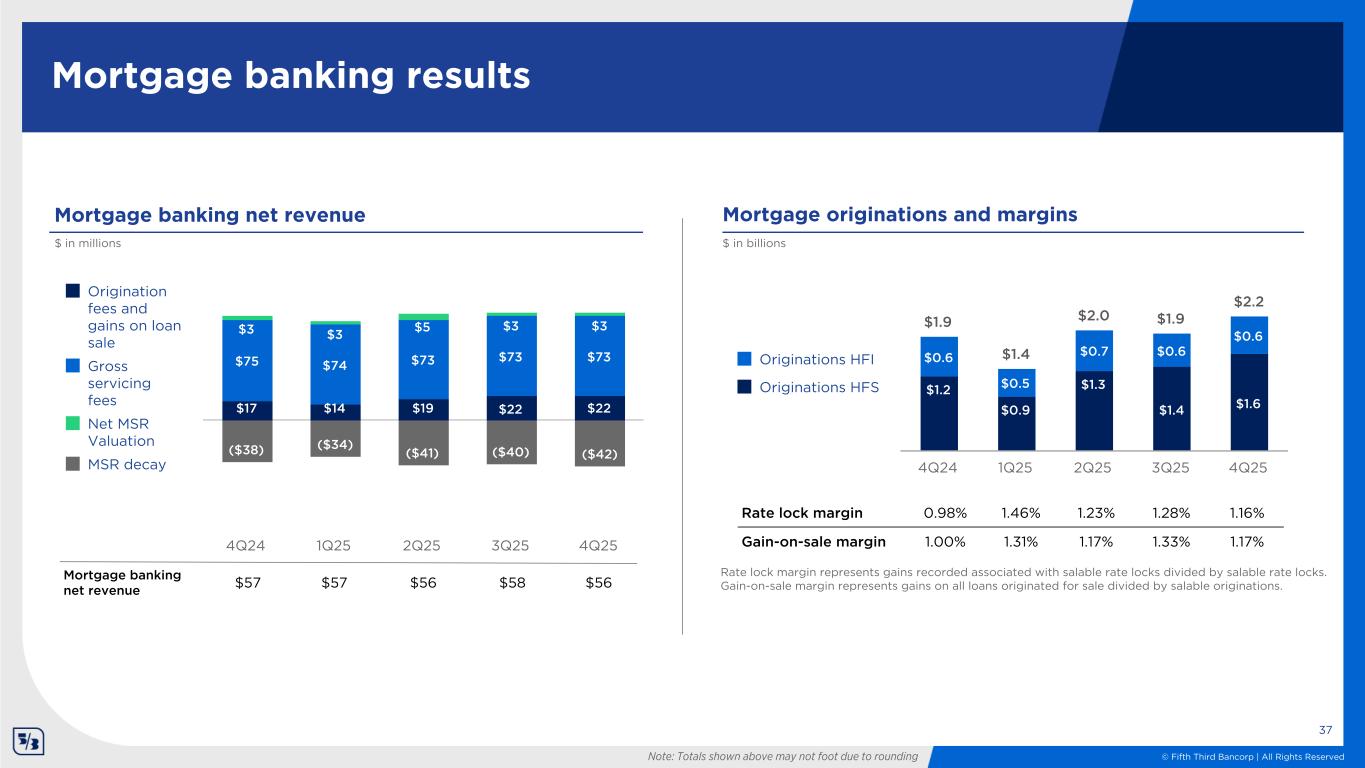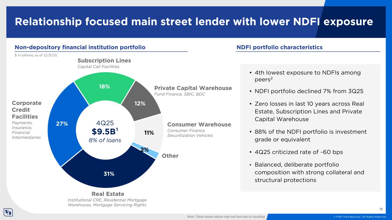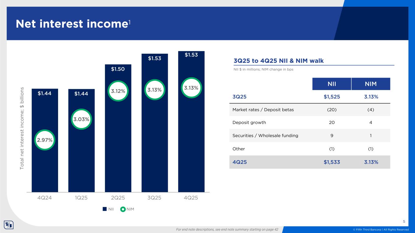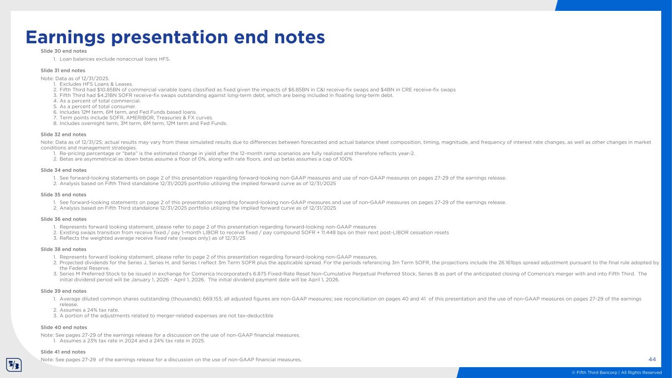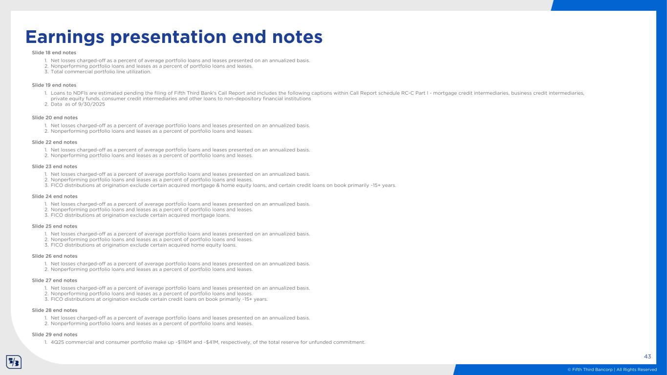 © Fifth Third Bancorp | All Rights Reserved Earnings presentation end notes 43 Slide 18 end notes 1. Net losses charged-off as a percent of average portfolio loans and leases presented on an annualized basis. 2. Nonperforming portfolio loans and leases as a percent of portfolio loans and leases. 3. Total commercial portfolio line utilization. Slide 19 end notes 1. Loans to NDFIs are estimated pending the filing of Fifth Third Bank's Call Report and includes the following captions within Call Report schedule RC-C Part I - mortgage credit intermediaries, business credit intermediaries, private equity funds, consumer credit intermediaries and other loans to non-depository financial institutions 2. Data as of 9/30/2025 Slide 20 end notes 1. Net losses charged-off as a percent of average portfolio loans and leases presented on an annualized basis. 2. Nonperforming portfolio loans and leases as a percent of portfolio loans and leases. Slide 22 end notes 1. Net losses charged-off as a percent of average portfolio loans and leases presented on an annualized basis. 2. Nonperforming portfolio loans and leases as a percent of portfolio loans and leases. Slide 23 end notes 1. Net losses charged-off as a percent of average portfolio loans and leases presented on an annualized basis. 2. Nonperforming portfolio loans and leases as a percent of portfolio loans and leases. 3. FICO distributions at origination exclude certain acquired mortgage & home equity loans, and certain credit loans on book primarily ~15+ years. Slide 24 end notes 1. Net losses charged-off as a percent of average portfolio loans and leases presented on an annualized basis. 2. Nonperforming portfolio loans and leases as a percent of portfolio loans and leases. 3. FICO distributions at origination exclude certain acquired mortgage loans. Slide 25 end notes 1. Net losses charged-off as a percent of average portfolio loans and leases presented on an annualized basis. 2. Nonperforming portfolio loans and leases as a percent of portfolio loans and leases. 3. FICO distributions at origination exclude certain acquired home equity loans. Slide 26 end notes 1. Net losses charged-off as a percent of average portfolio loans and leases presented on an annualized basis. 2. Nonperforming portfolio loans and leases as a percent of portfolio loans and leases. Slide 27 end notes 1. Net losses charged-off as a percent of average portfolio loans and leases presented on an annualized basis. 2. Nonperforming portfolio loans and leases as a percent of portfolio loans and leases. 3. FICO distributions at origination exclude certain credit loans on book primarily ~15+ years. Slide 28 end notes 1. Net losses charged-off as a percent of average portfolio loans and leases presented on an annualized basis. 2. Nonperforming portfolio loans and leases as a percent of portfolio loans and leases. Slide 29 end notes 1. 4Q25 commercial and consumer portfolio make up ~$116M and ~$41M, respectively, of the total reserve for unfunded commitment.