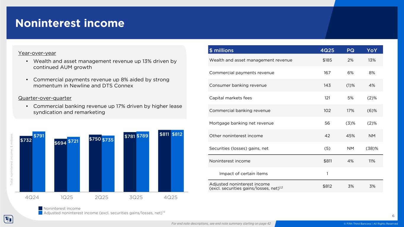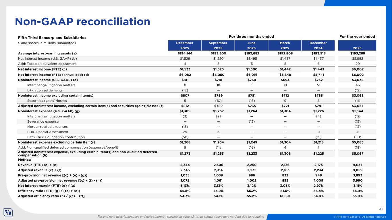 © Fifth Third Bancorp | All Rights Reserved Non-GAAP reconciliation 41 Fifth Third Bancorp and Subsidiaries For three months ended For the year ended $ and shares in millions (unaudited) December September June March December 2025 2025 2025 2025 2024 2025 Average interest-earning assets (a) $194,144 $193,500 $192,682 $192,808 $193,513 $193,288 Net interest income (U.S. GAAP) (b) $1,529 $1,520 $1,495 $1,437 $1,437 $5,982 Add: Taxable equivalent adjustment 4 5 5 5 6 20 Net interest income (FTE) (c) $1,533 $1,525 $1,500 $1,442 $1,443 $6,002 Net interest income (FTE) (annualized) (d) $6,082 $6,050 $6,016 $5,848 $5,741 $6,002 Noninterest income (U.S. GAAP) (e) $811 $781 $750 $694 $732 $3,035 Interchange litigation matters 8 18 1 18 51 45 Litigation settlements (12) — — — — (12) Noninterest income excluding certain item(s) $807 $799 $751 $712 $783 $3,068 Securities (gains)/losses 5 (10) (16) 9 8 (11) Adjusted noninterest income, excluding certain item(s) and securities (gains)/losses (f) $812 $789 $735 $721 $791 $3,057 Noninterest expense (U.S. GAAP) (g) $1,309 $1,267 $1,264 $1,304 $1,226 $5,144 Interchange litigation matters (3) (9) — — (4) (12) Severance expense — — (15) — — (15) Merger-related expenses (13) — — — — (13) FDIC Special Assessment 25 6 — — 11 31 Fifth Third Foundation contribution (50) — — — (15) (50) Noninterest expense excluding certain item(s) $1,268 $1,264 $1,249 $1,304 $1,218 $5,085 Add: Non-qualified deferred compensation (expense)/benefit 5 (11) (16) 4 7 (18) Adjusted noninterest expense, excluding certain item(s) and non-qualified deferred compensation (h) $1,273 $1,253 $1,233 $1,308 $1,225 $5,067 Metrics: Revenue (FTE) (c) + (e) 2,344 2,306 2,250 2,136 2,175 9,037 Adjusted revenue (c) + (f) 2,345 2,314 2,235 2,163 2,234 9,059 Pre-provision net revenue [(c) + (e) - (g)] 1,035 1,039 986 832 949 3,893 Adjusted pre-provision net revenue [(c) + (f) - (h)] 1,072 1,061 1,002 855 1,009 3,990 Net interest margin (FTE) (d) / (a) 3.13% 3.13% 3.12% 3.03% 2.97% 3.11% Efficiency ratio (FTE) (g) / [(c) + (e)] 55.8% 54.9% 56.2% 61.0% 56.4% 56.9% Adjusted efficiency ratio (h) / [(c) + (f)] 54.3% 54.1% 55.2% 60.5% 54.8% 55.9% For end note descriptions, see end note summary starting on page 42; totals shown above may not foot due to rounding